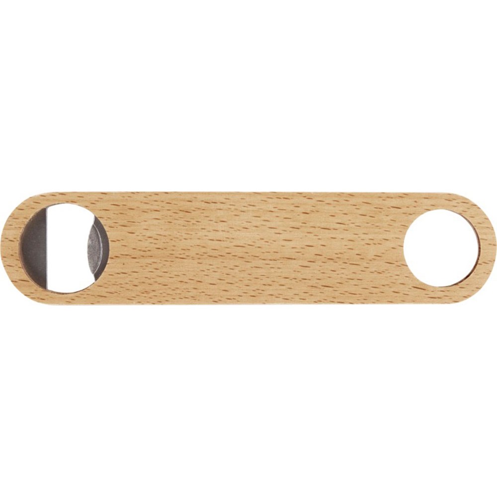 Открывалка для бутылок из нержавеющей стали с деревянной поверхностью. Имеет вешалку на ручке. Дерево, нержавеющая сталь.
