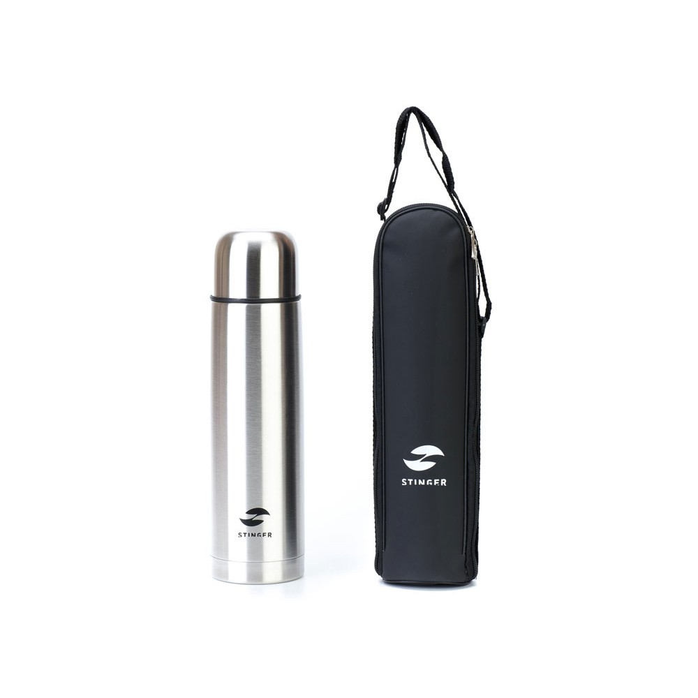 Термос Stinger с чехлом, 1 л, узкий, сталь/кожзаменитель, с чехлом, серебристый, 8,6 х 8,6 х 31,4 см
