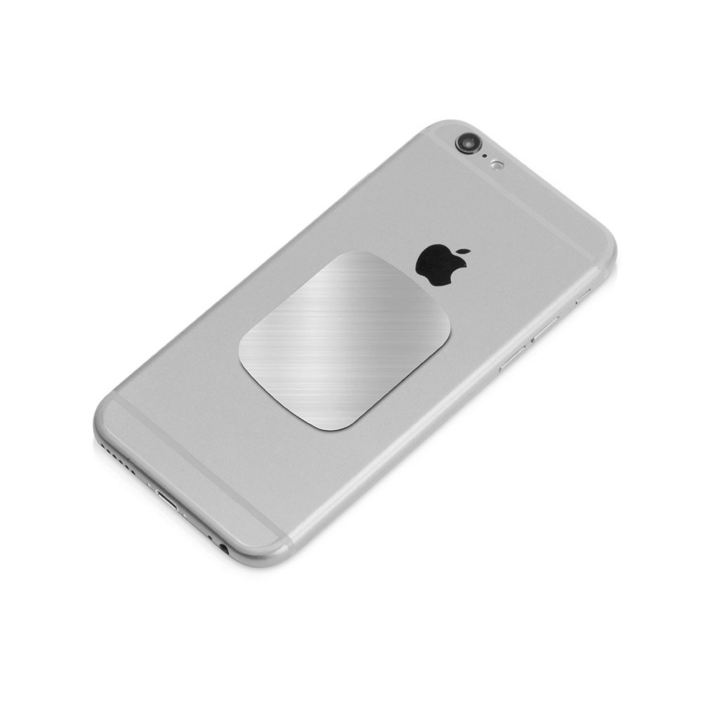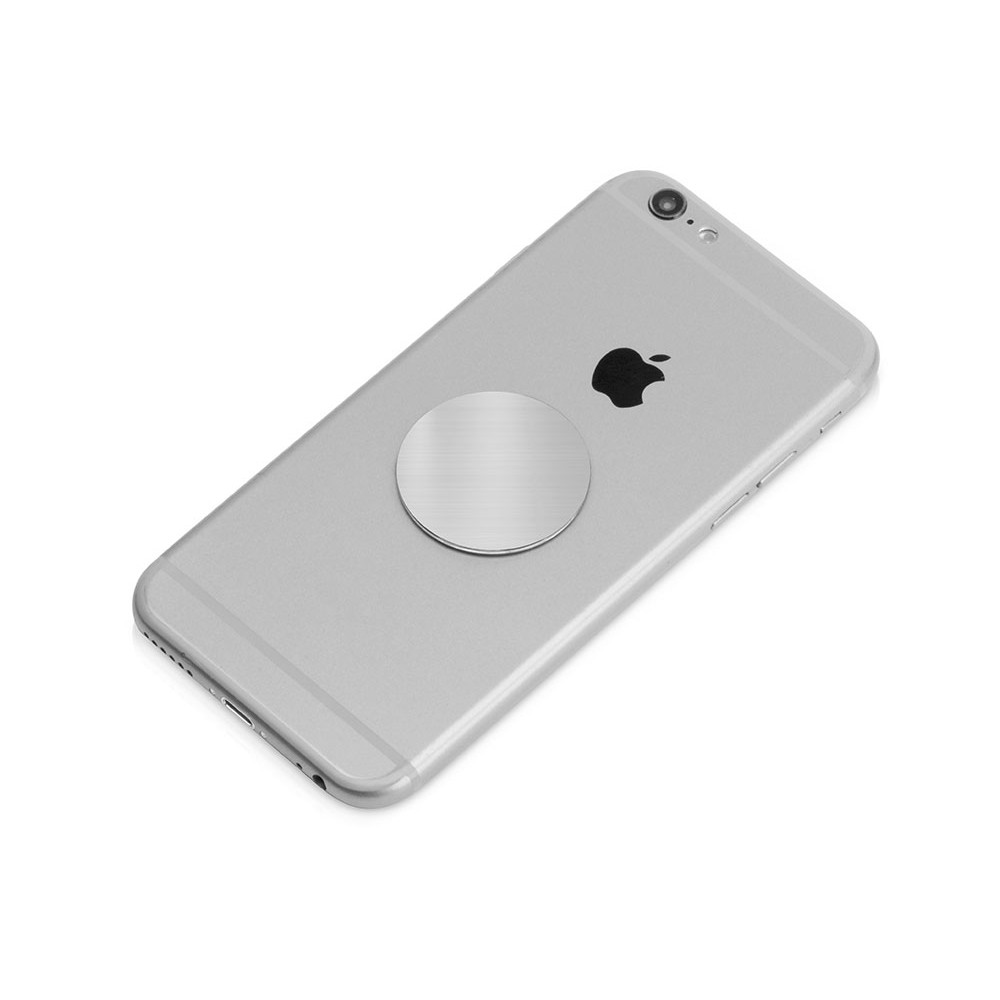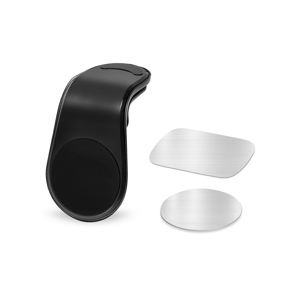 Магнитный держатель для телефона крепится к вентиляционной решетке автомобиля при помощи прищепки, которая снабжена прорезиненными вставками для плотного сцепления с поверхностью. Также в комплекте идут 2 самоклеящиеся стальные пластины. Они крепятся к смартфону.