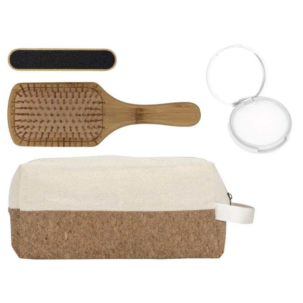 Материал товара расческа, пилка для ногтей - бамбук, бальзам для губ -пластик, несессер - хлопок, пробка, ручка - полиэстер