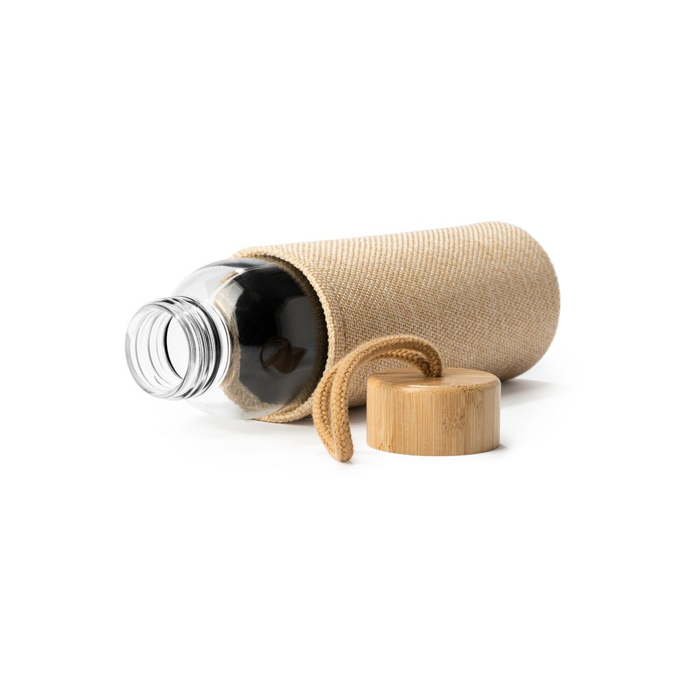 Стеклянная бутылка с оригинальным чехлом, имитирующим джут, и бамбуковой крышкой с практичной ручкой для переноски. Емкость 500 мл.