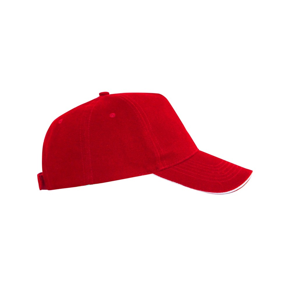 Бейсболка из 5 панелей с контрастным сэндвичем. Четыре вышитых вентиляционных люверса. Застежка на липучку.