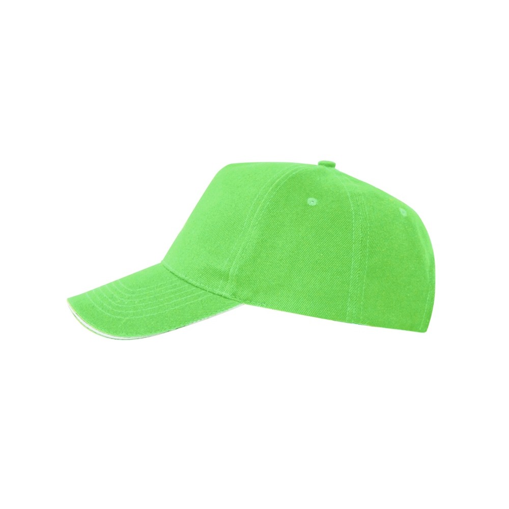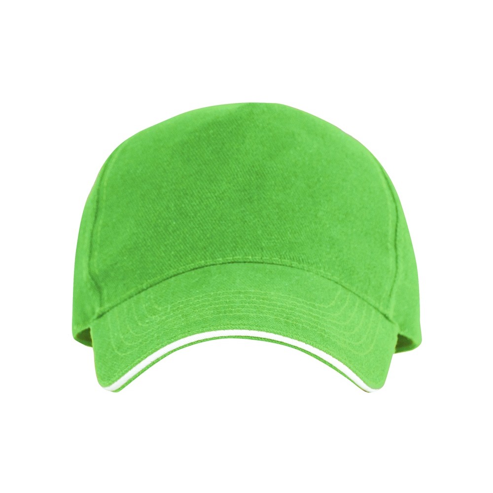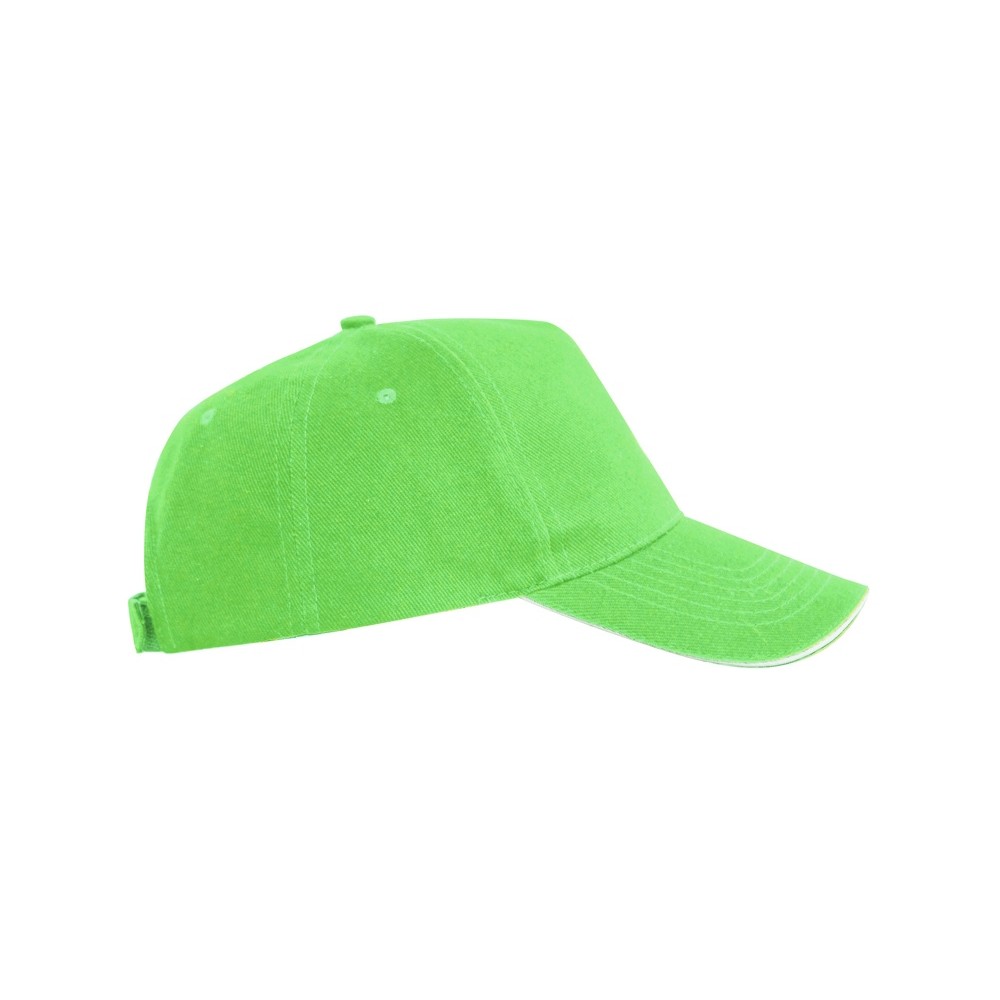 Бейсболка из 5 панелей с контрастным сэндвичем. Четыре вышитых вентиляционных люверса. Застежка на липучку.