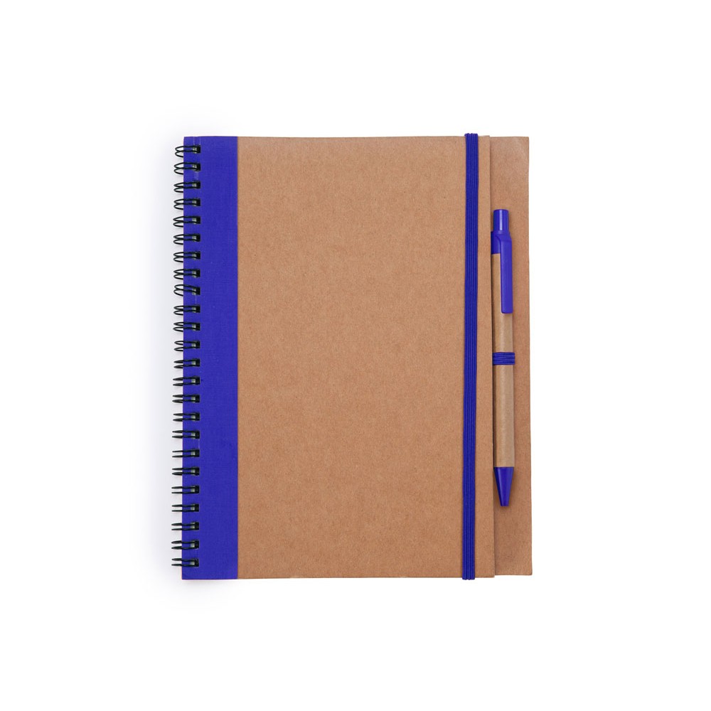 Блокнот на спирали с жесткой обложкой из переработанного картона. Включает шариковую ручку с синими чернилами. 60 простых листов.