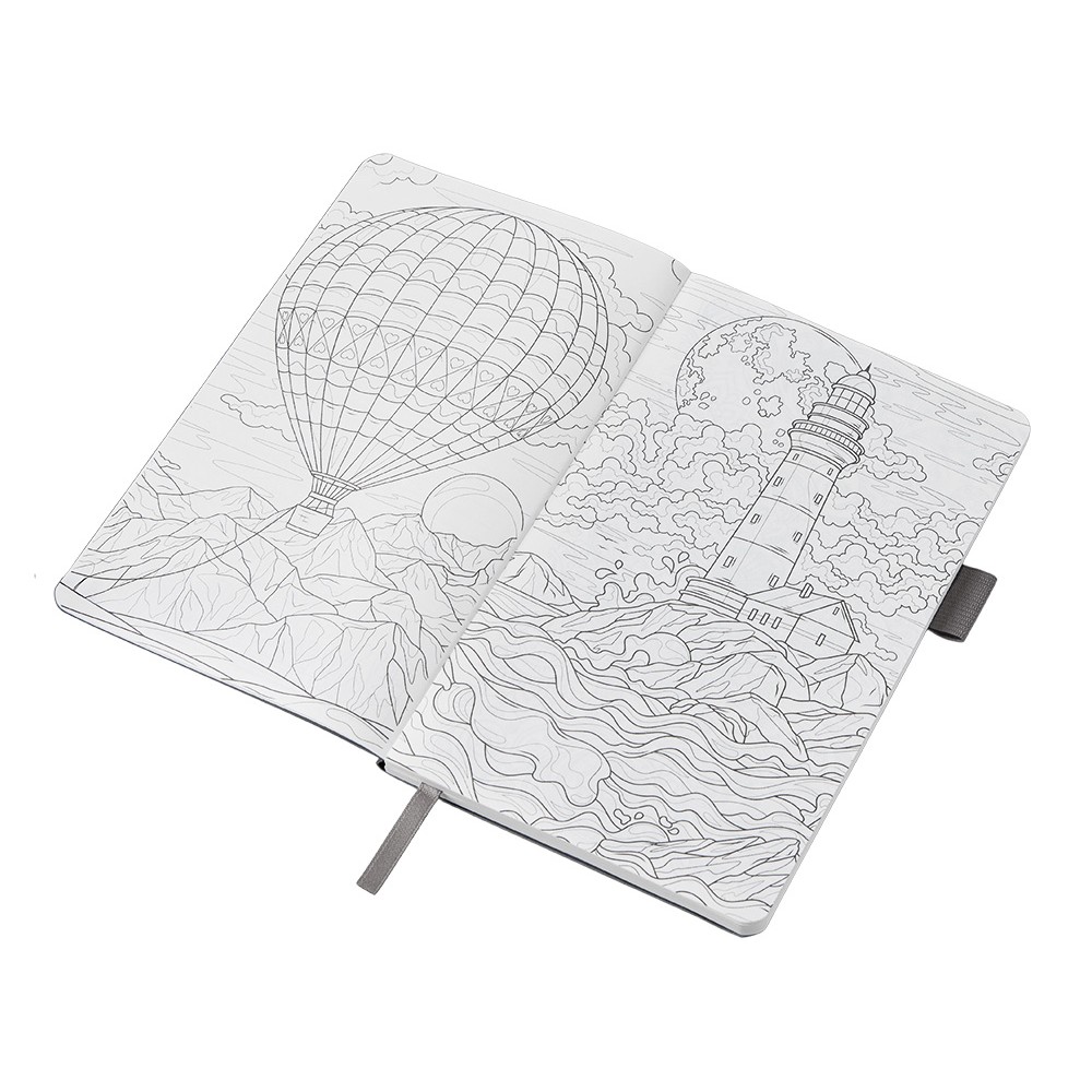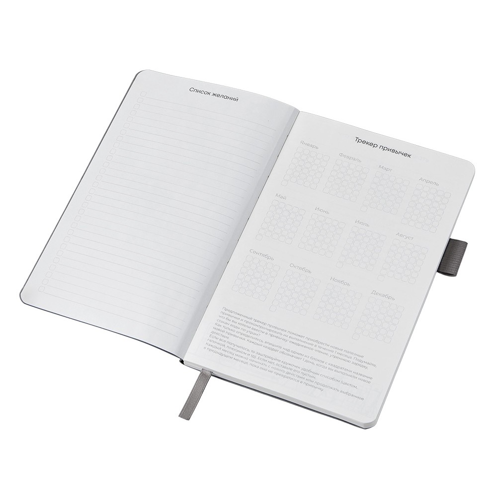 Необычный для блокнота вводный блок включает трекер привычек, списки книг и фильмов, а также 4 страницы для раскрашивания с картинками и мандалами.