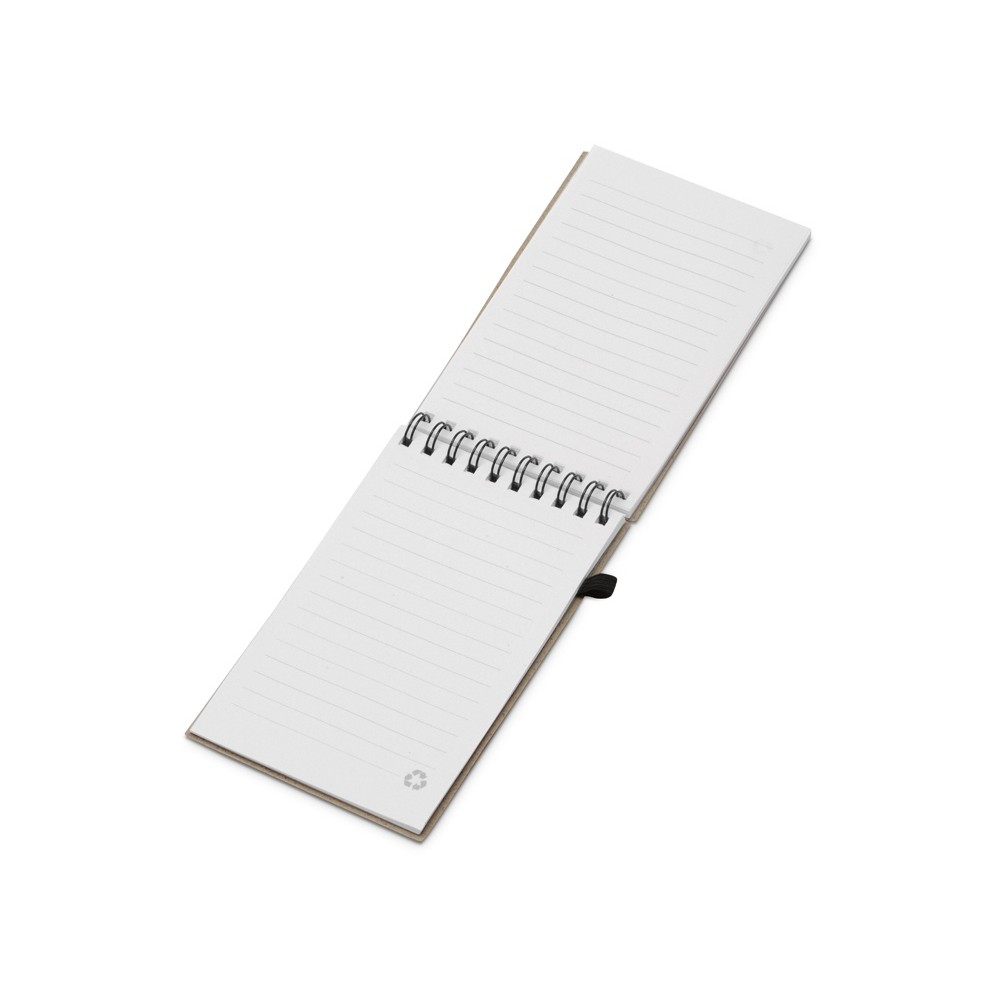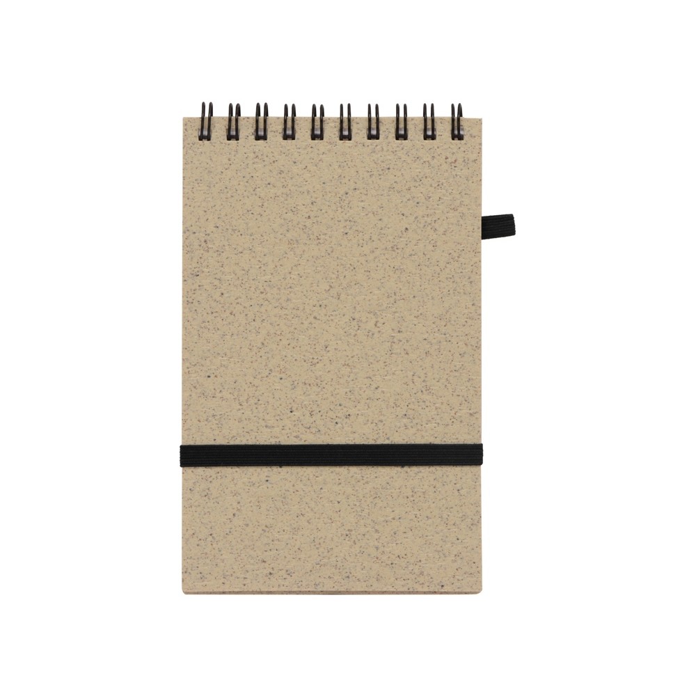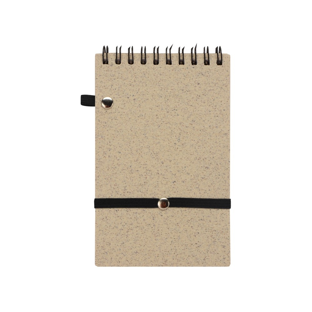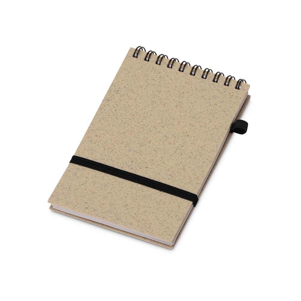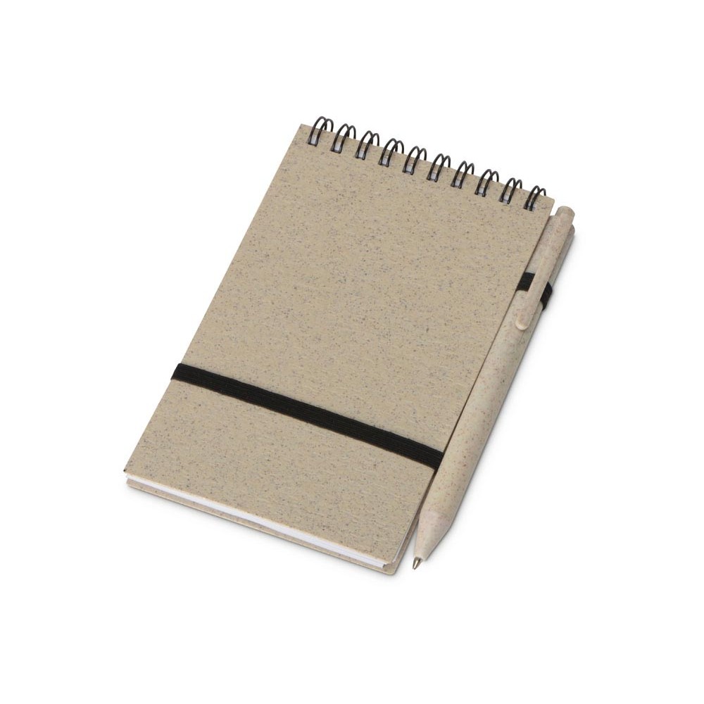 Блокнот с обложкой из переработанной пшеницы и пластика. Блок состоит из 60 листов переработанной бумаги белого цвета. Крепление - пружина. В комплекте шариковая ручка из пшеничной соломы.