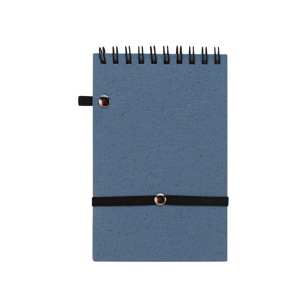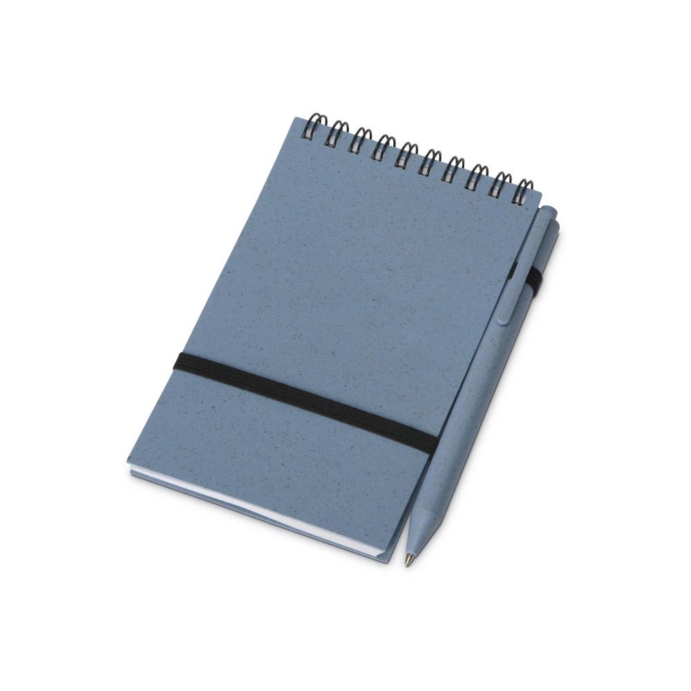 Блокнот с обложкой из переработанной пшеницы и пластика. Блок состоит из 60 листов переработанной бумаги белого цвета. Крепление - пружина. В комплекте шариковая ручка из пшеничной соломы.