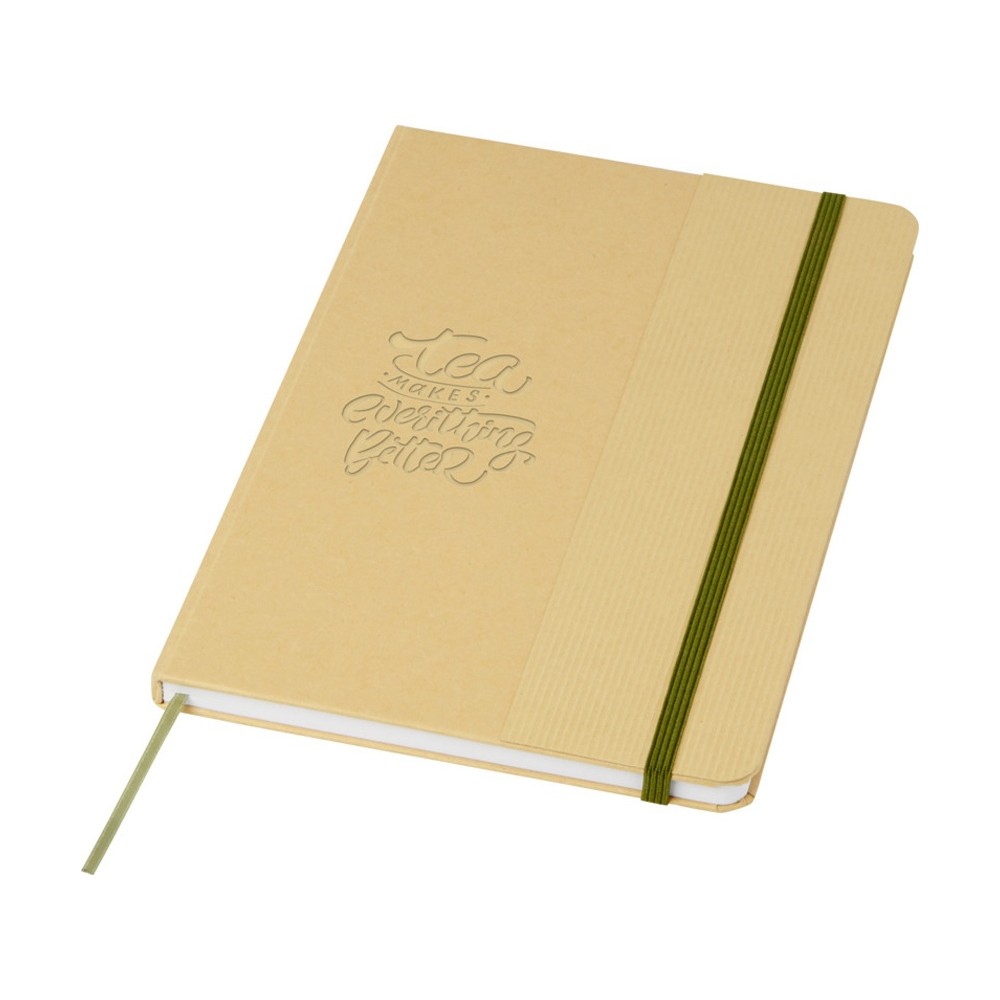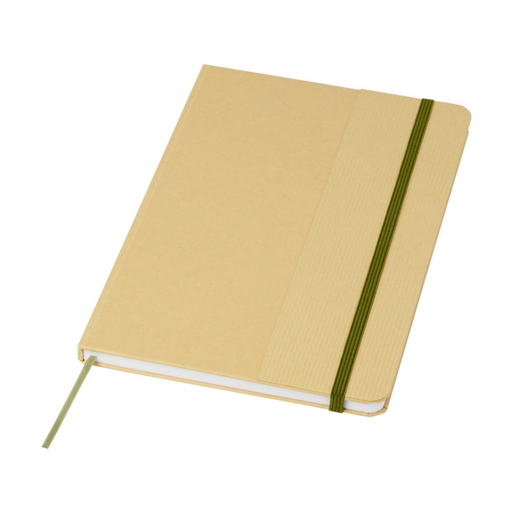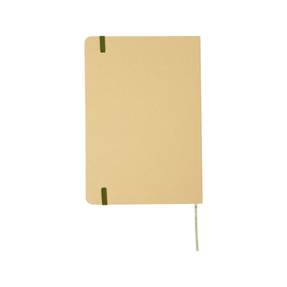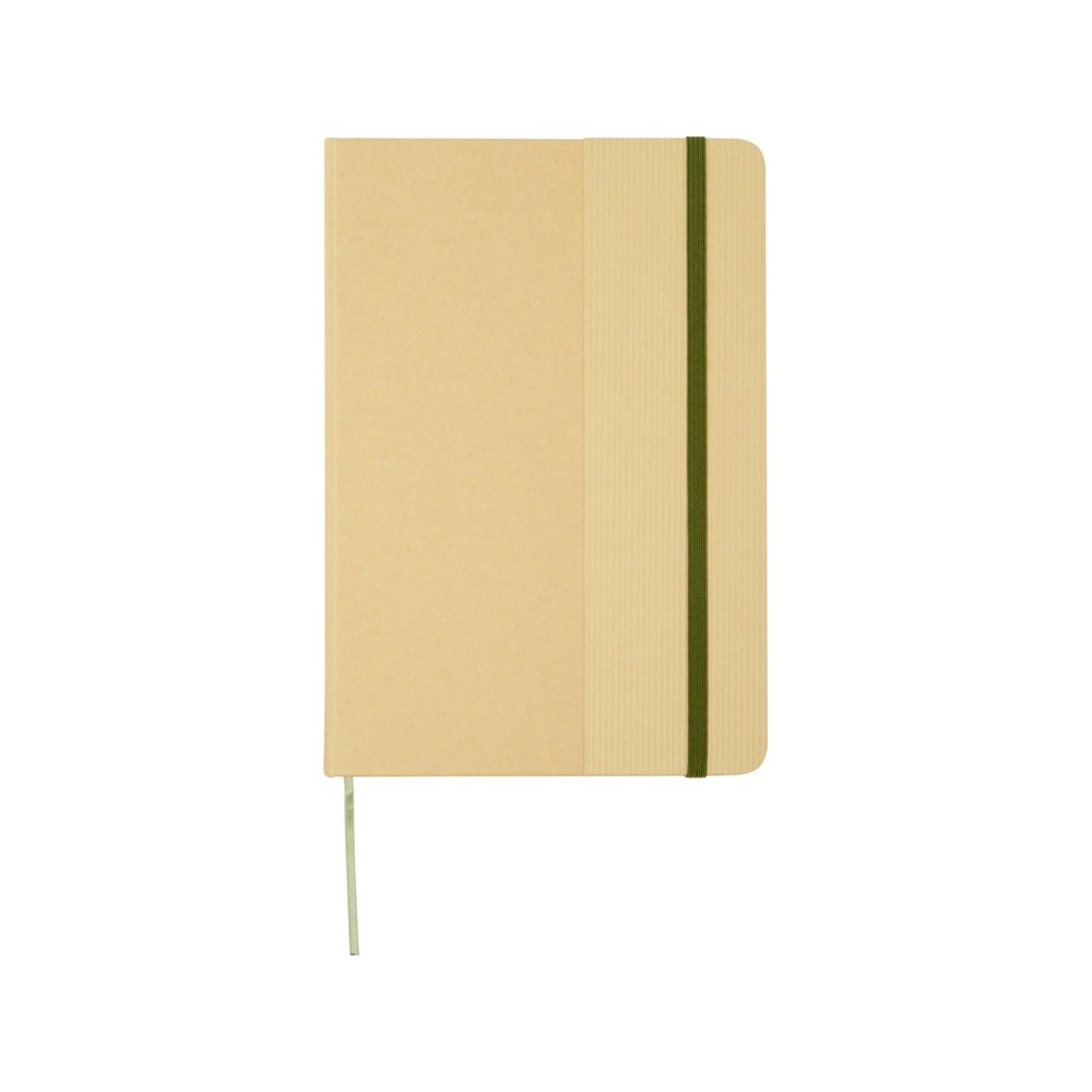 Блокнот формата А5 в твердой обложке из переработанного картона, 80 листов бумаги плотностью 70 г/м² в линейку. Блокнот имеет эластичную застежку, ленту и закругленные углы. FSC certified paper. FSC Mix 100% P7.1 CU-COC-877277.