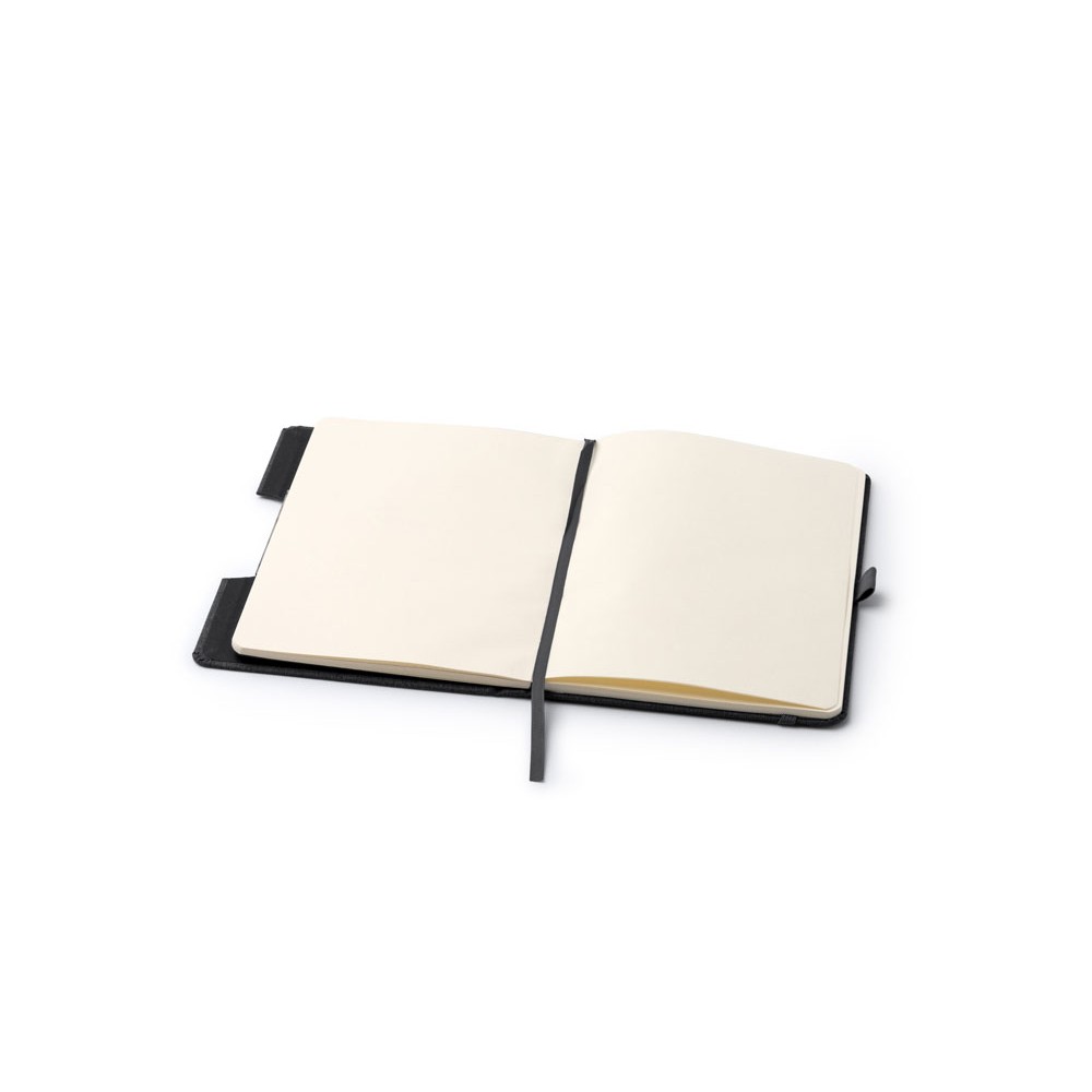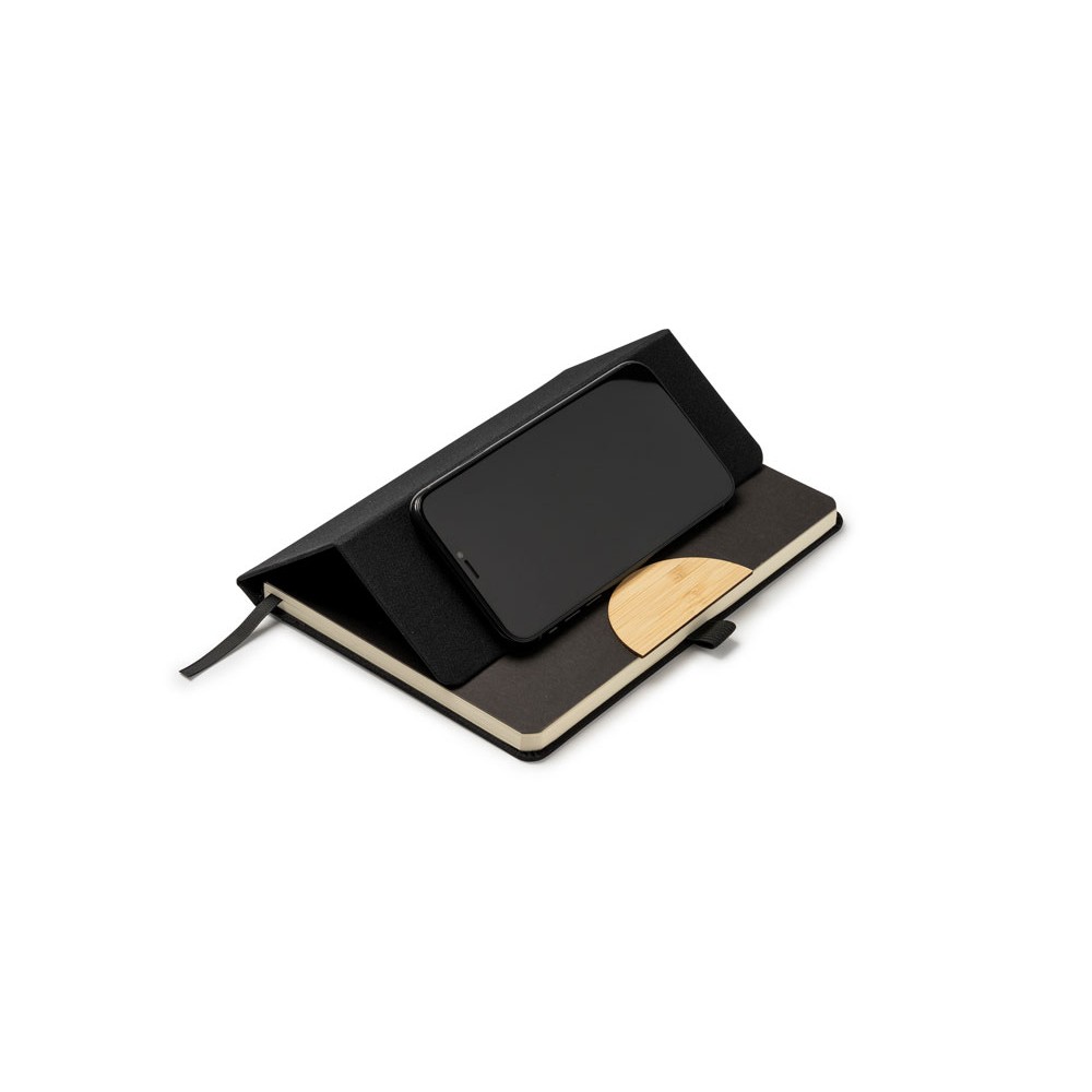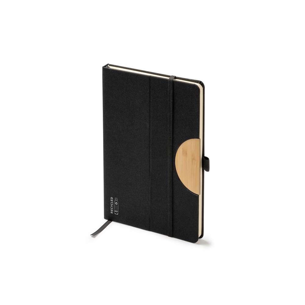 Блокнот формата А5 с жесткой обложкой из RPET с функцией подставки. Эластичная застежка, закладка и держатель для ручки. 80 листов.