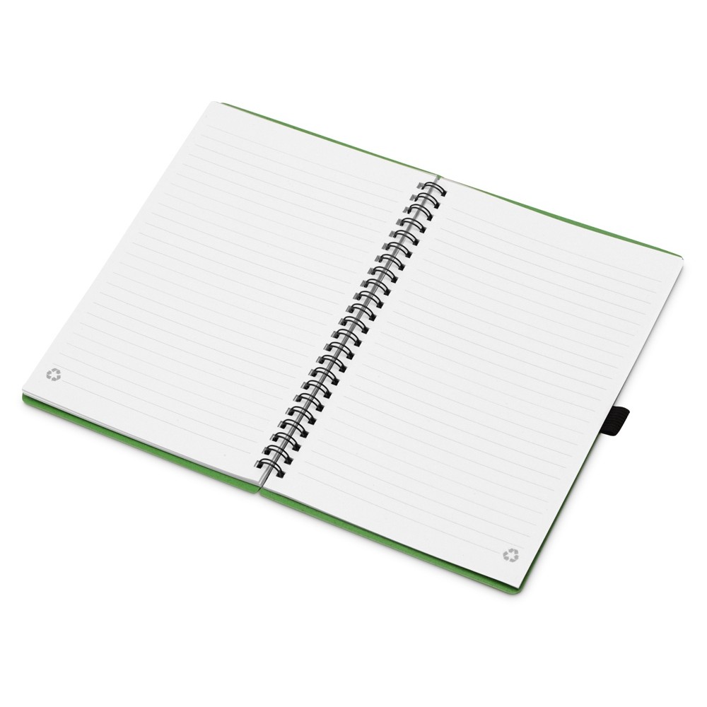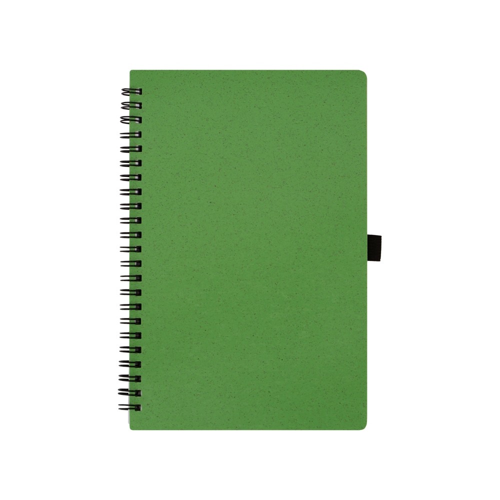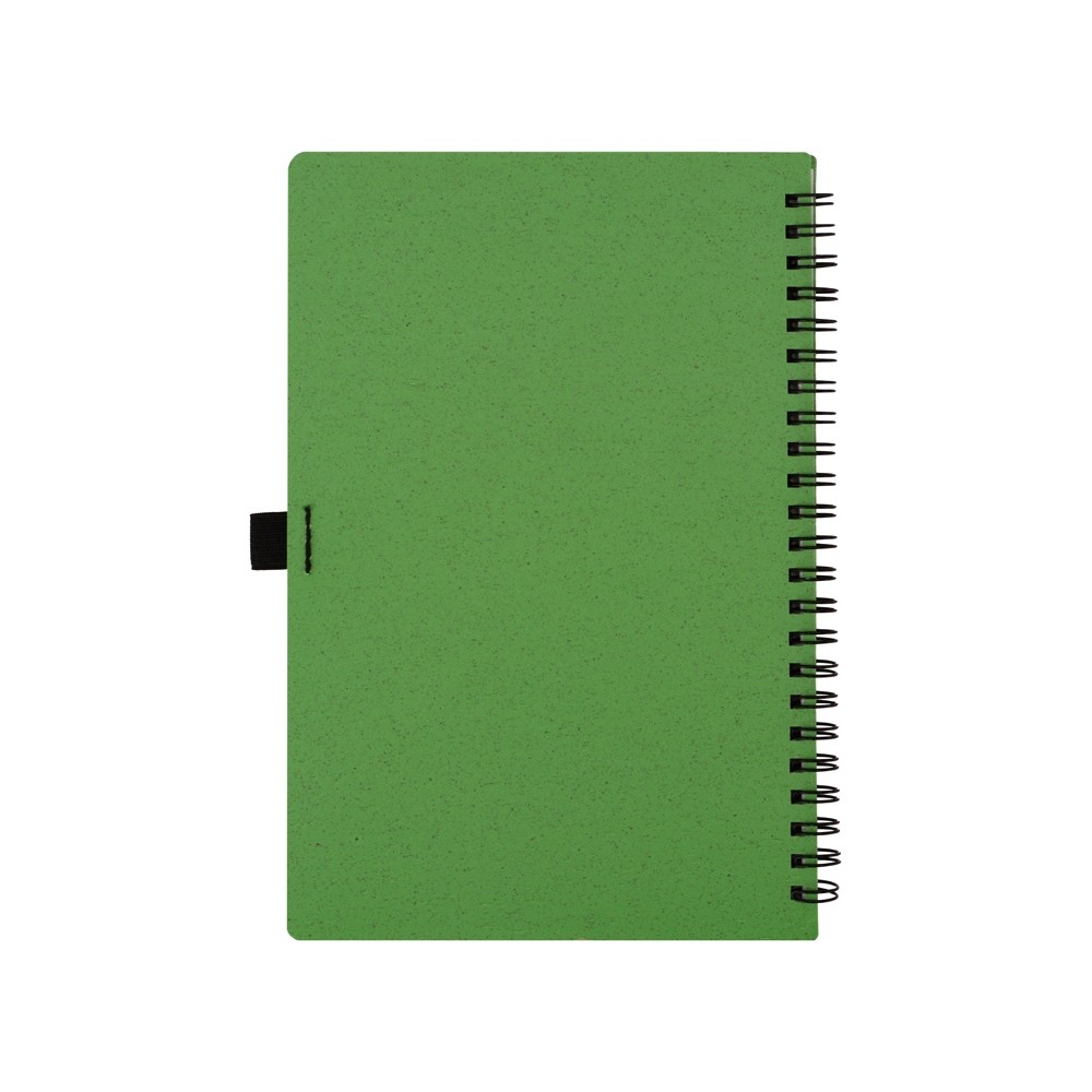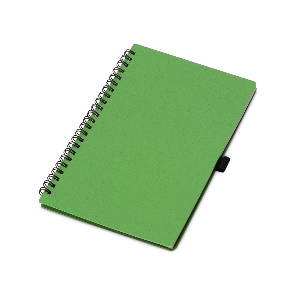 Блокнот с обложкой из переработанной пшеницы и пластика. Блок состоит из 70 листов переработанной бумаги белого цвета. Крепление - пружина. Дополнен петлей для ручки.
