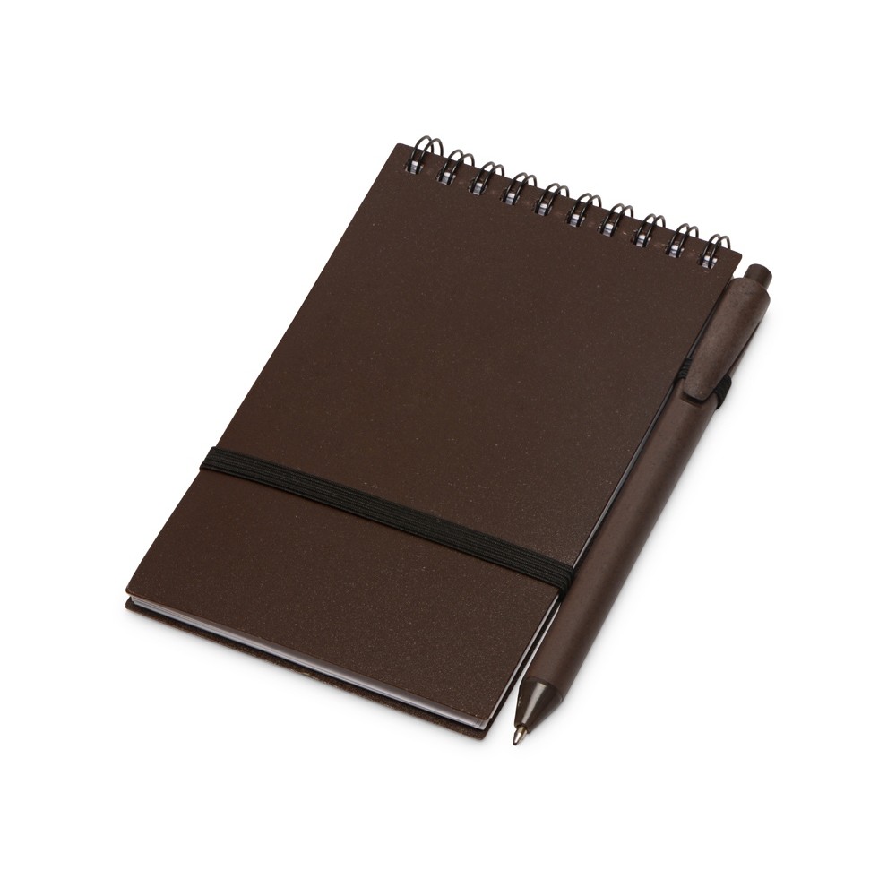 Оригинальный блокнот с обложкой из пластика и кофейного жмыха, а также блоком из переработанной бумаги. Петля для ручки и горизонтальная резинка расширяют функциональность.