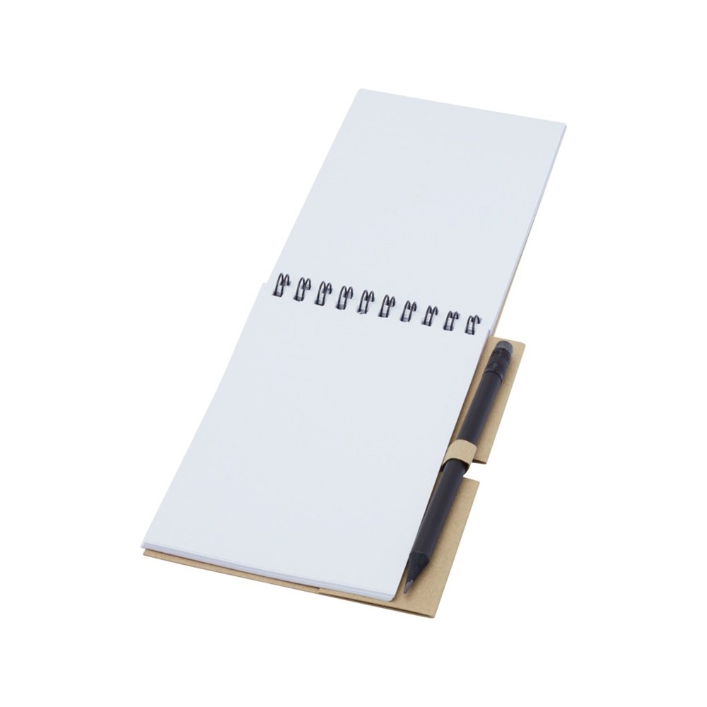 Блокнот на гребне из 40 листов плотностью 80 г/м², обложка и листы изготовлены из переработанной бумаги, соответствующей FSC, без декора. В комплект входит черный карандаш. Блокнот изготовлен в Италии.