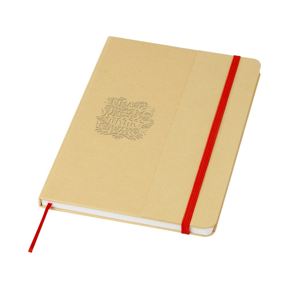 Блокнот формата А5 в твердой обложке из переработанного картона, 80 листов бумаги плотностью 70 г/м² в линейку. Блокнот имеет эластичную застежку, ленту и закругленные углы. FSC certified paper. FSC Mix 100% P7.1 CU-COC-877277.