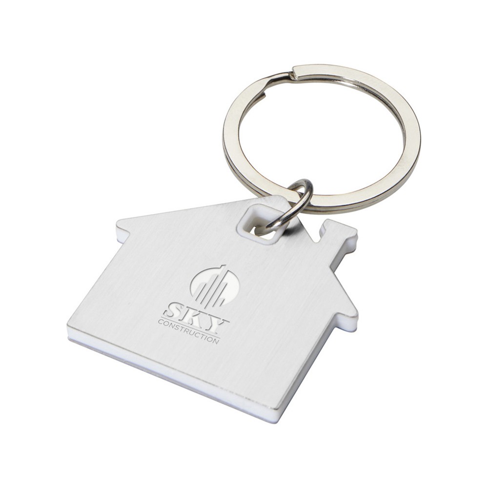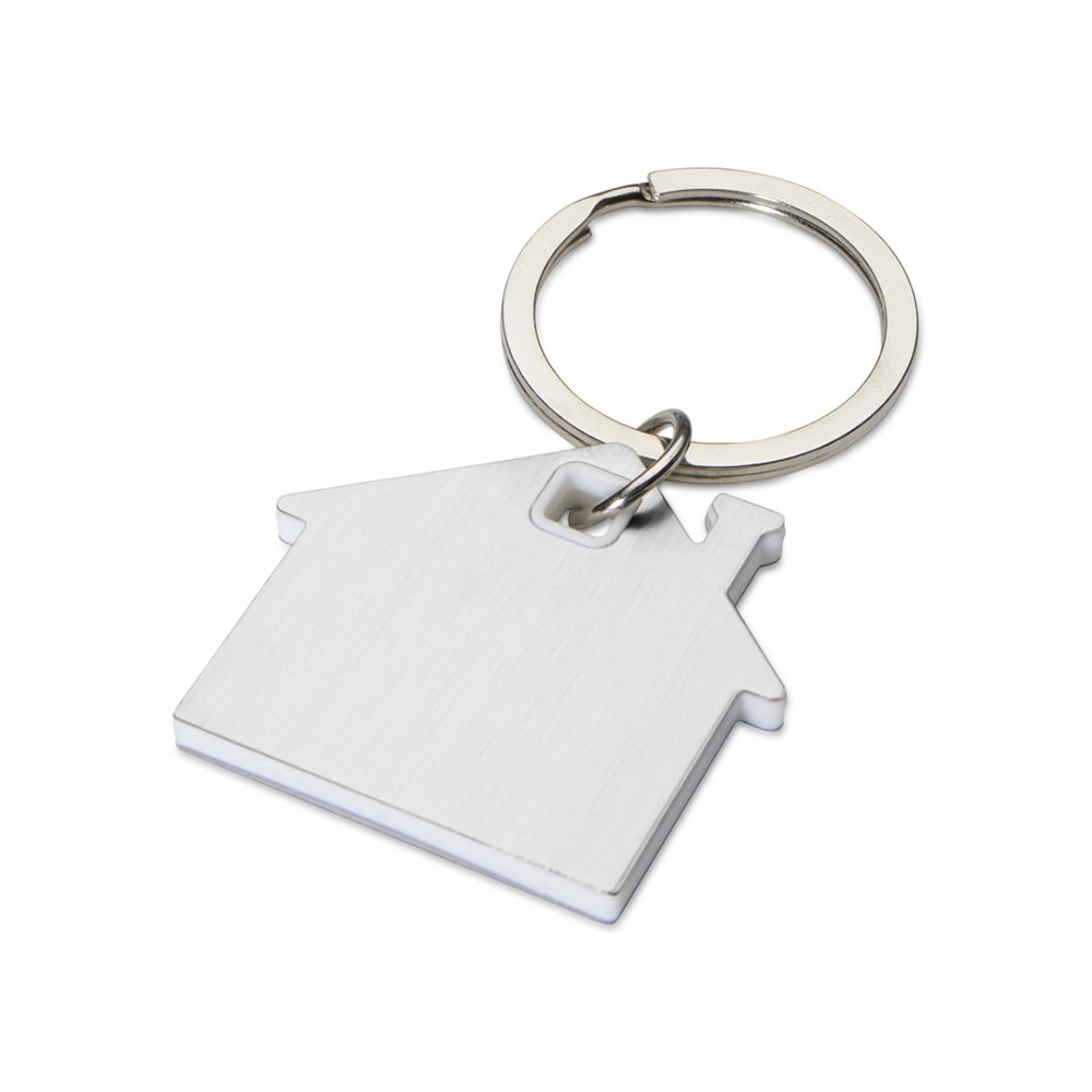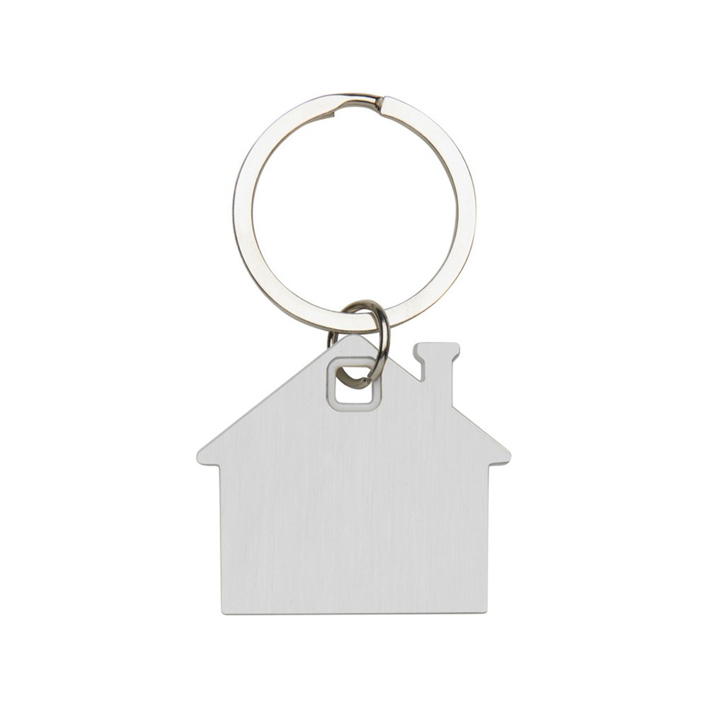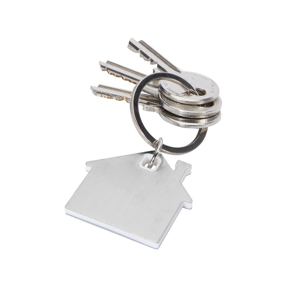 Брелок для ключей в форме домика с цветной вставкой из пластика между 2-мя серебристыми пластинами из стали.