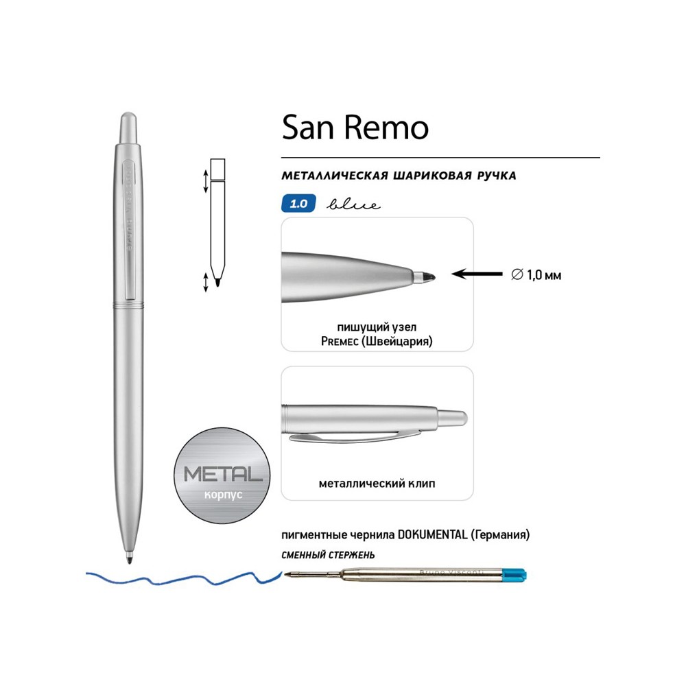 Металлическая шариковая ручка San Remo - аксессуар, призванный стать настоящим элементом стиля, подчеркнуть индивидуальность его владельца.