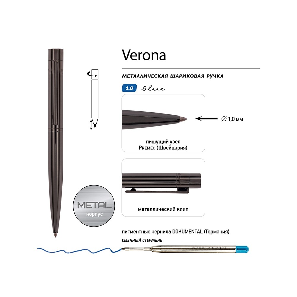 Технические характеристики Ручка металлическая шариковая "Verona", вороненая сталь, 1.0 мм, синяя