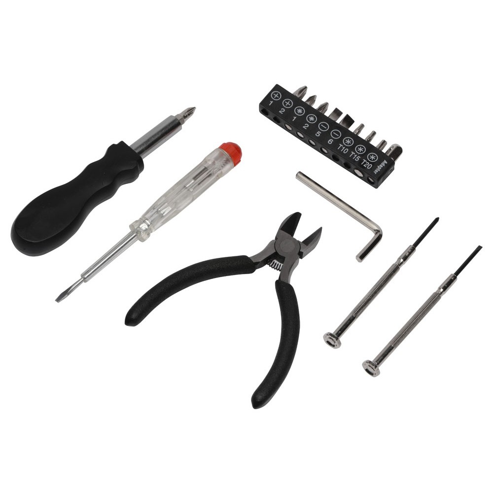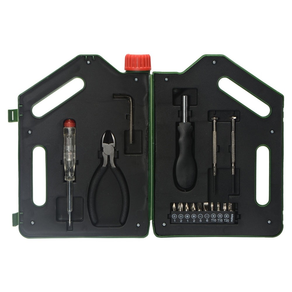 Набор инструментов в футляре в виде канистры включает в себя 1 тестер напряжения, 1 пару плоскогубцев, 1 шестигранный ключ, 1 рукоятку, к которой можно крепить отвертки, 2 прецизионные отвертки, 1 крестообразную головку, 1 плоскую головку, 10 бит.