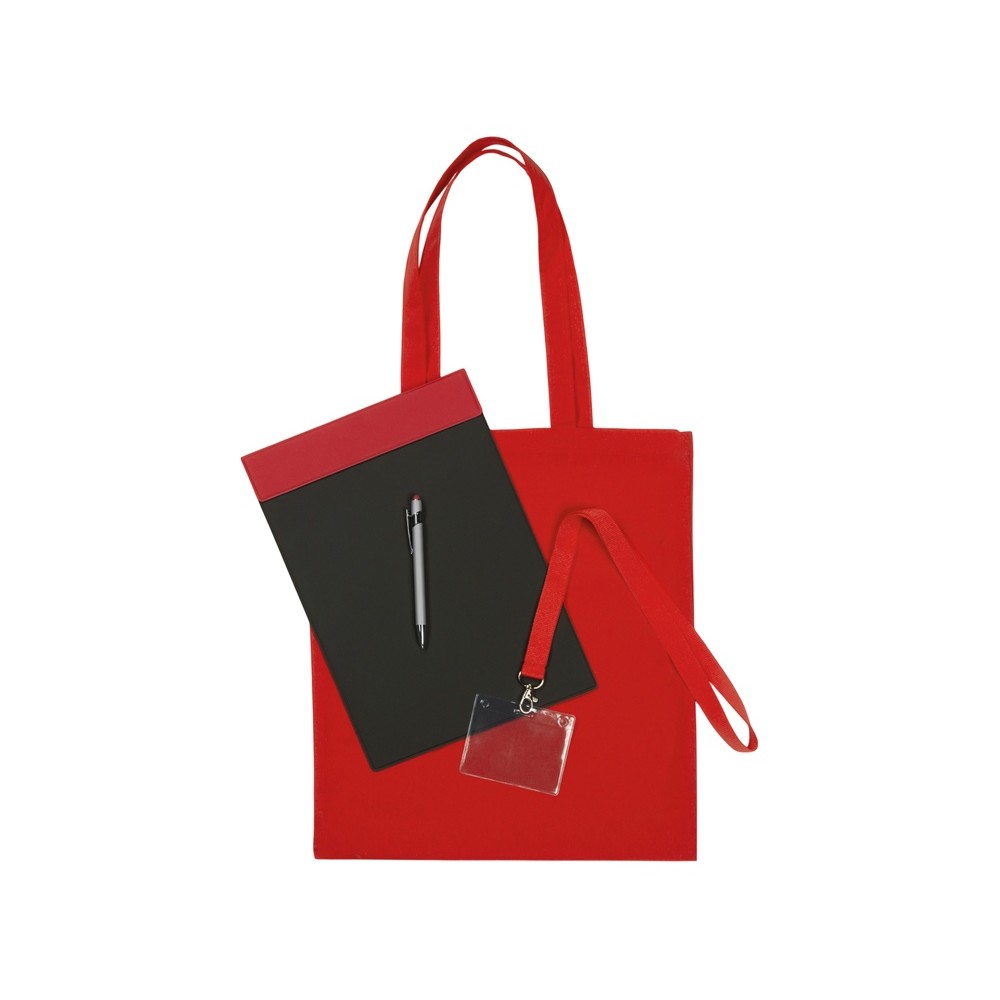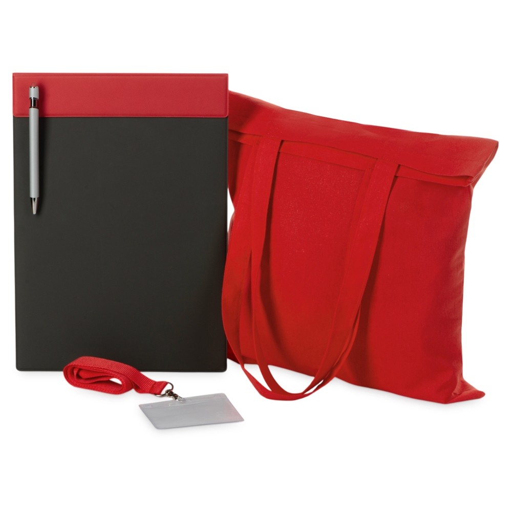 Базовый набор для конференций. В наборе: магнитный планшет для бумаг, ручка для записей, ланъярд и чехол для бейджа участника и шоппер, в который все можно удобно сложить.