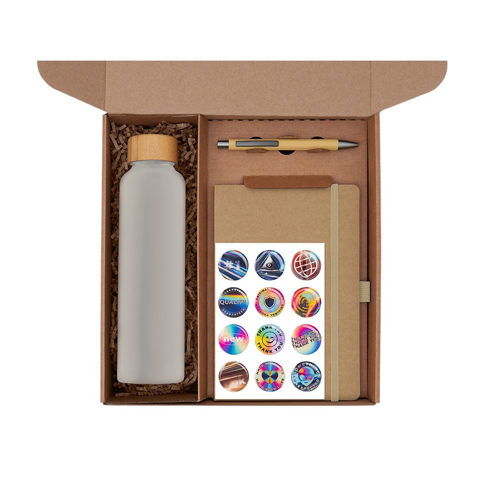 Материал товара бутылка - боросиликатное стекло, бамбук, блокнот - картон, бумага, ручка - бамбук, пластик, подставка - бамбук, наполнитель - бумага, стикеры - смола, коробка - картон