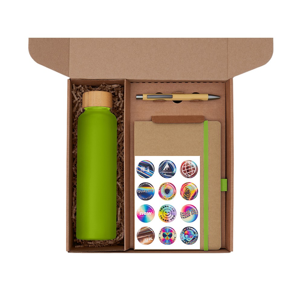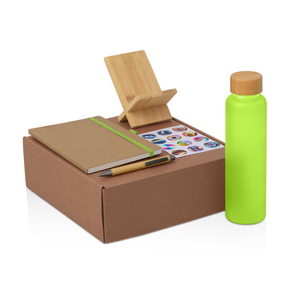 • Подарочный набор с бутылкой для воды. блокнотом, ручкой и подставкой для телефона, зеленое яблоко