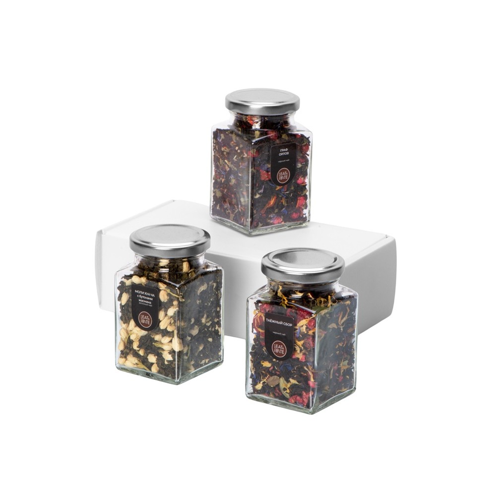 Вес970 Комплектностьчай таежный сбор черный, чай граф Орлов черный, чай моли хуа с бутонами жасмина зеленый Материал товарабанка -стекло, крышка- металл