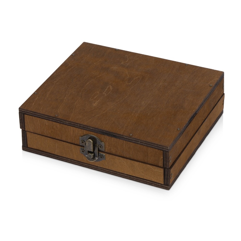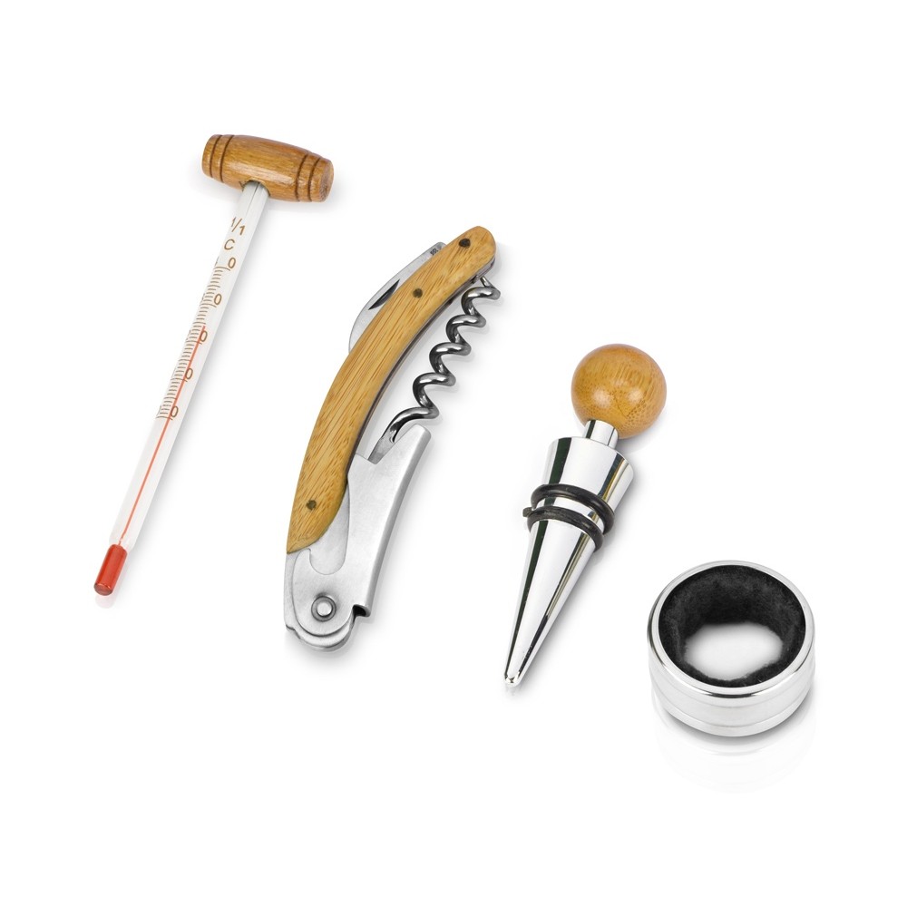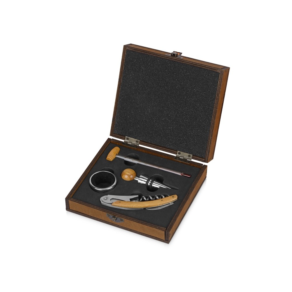 В набор аксессуаров для вина входят штопор-открывалка, воротничок на бутылку, пробка для бутылки и даже термометр. Набор поставляется в презентабельном деревянном футляре.