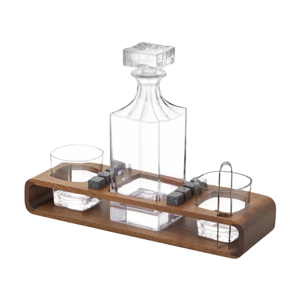 Вес2935 Комплектностьподставка, графин, бокалы, щипцы, мешочек, камни для виски Материал товарасодовое стекло, дерево сапеле, гранит, нержавеющая сталь