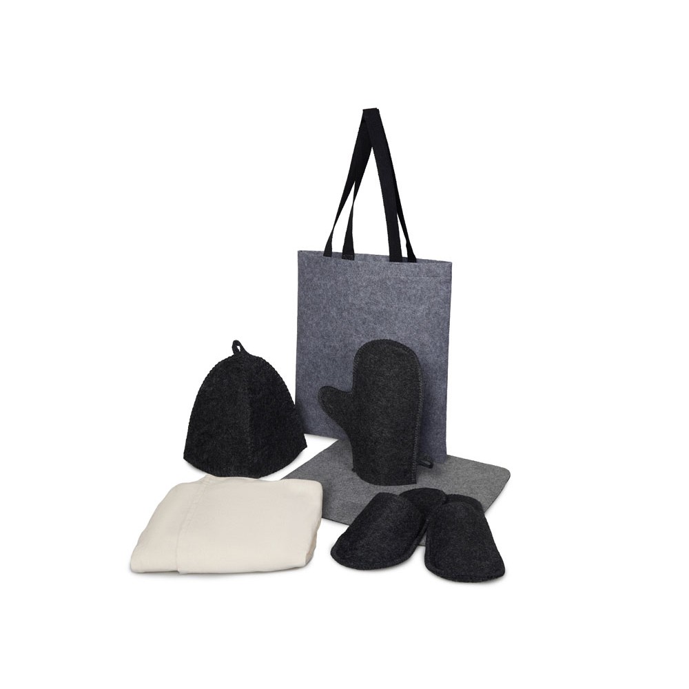 Женский банный набор "Healing" для комфортного отдыха: лежак для бани, холщовый килт-парео, рукавица, шапка и тапочки — всё аккуратно упаковано в стильный фетровый шоппер.