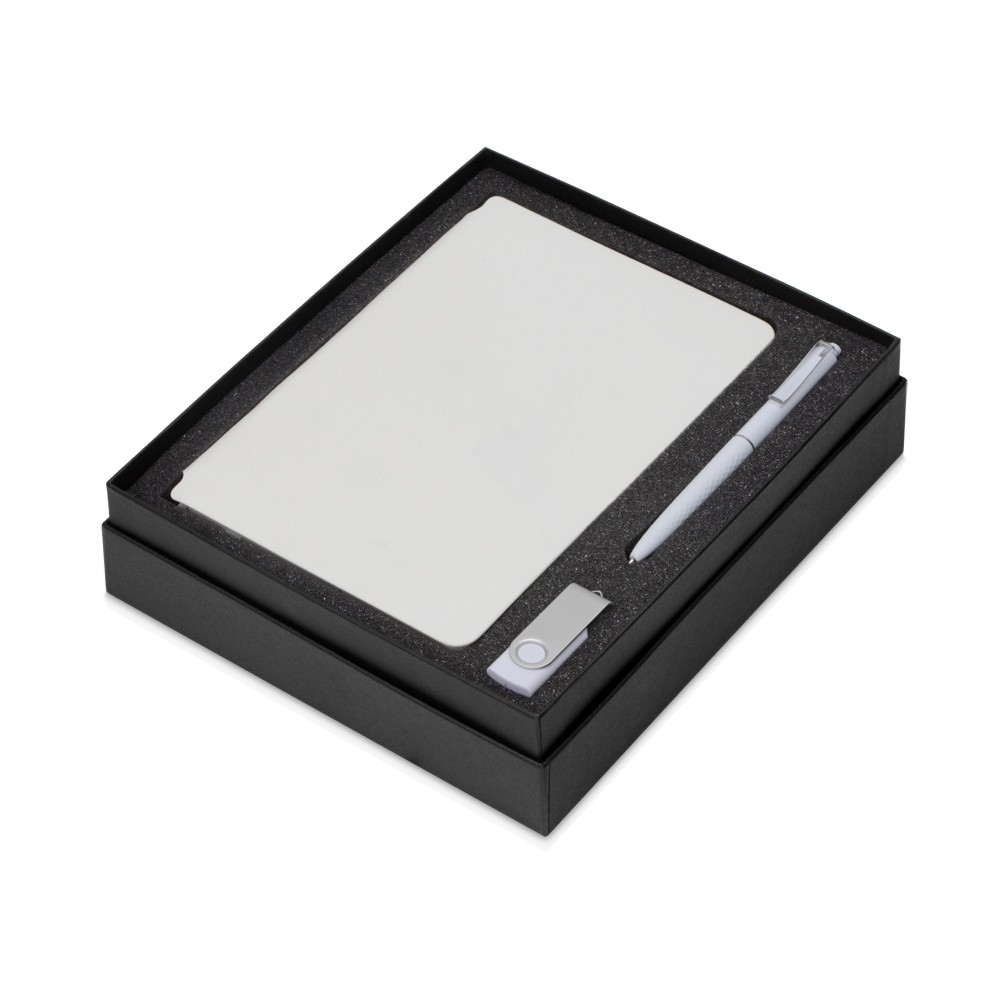 Цвет товара блокнот- белый, флешка- белый/серебристый, ручка- белый