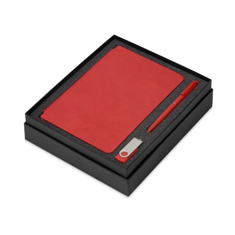 Цвет товара блокнот- красный, флешка- красный/серебристый, ручка- красный
