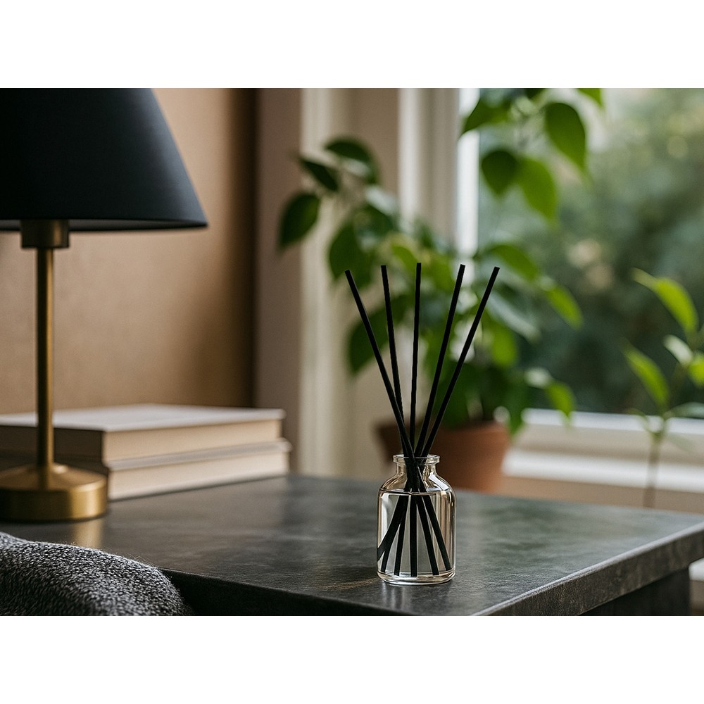 Прозрачный флакон без лишних деталей гармонично впишется в любой интерьер, а чёрные фибровые палочки обеспечат равномерное и продолжительное распространение аромата.