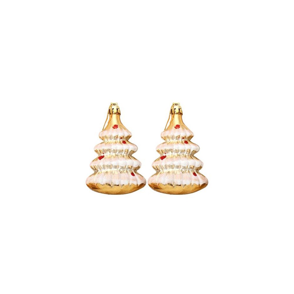 Новогодние украшения в оригинальной форме елочки будут отлично смотреться на вашей ели. Золотой цвет игрушек делает атмосферу радостнее и праздничнее. Такие украшения будут красиво смотреться как на белой, так и на зеленой хвое. В набор входят 2 елочных игрушки, которые выполнены из пластика - легкого и прочного материала, поэтому они будут красоваться на вашей елке не один год. Такой набор послужит отличным подарком для ваших близких.