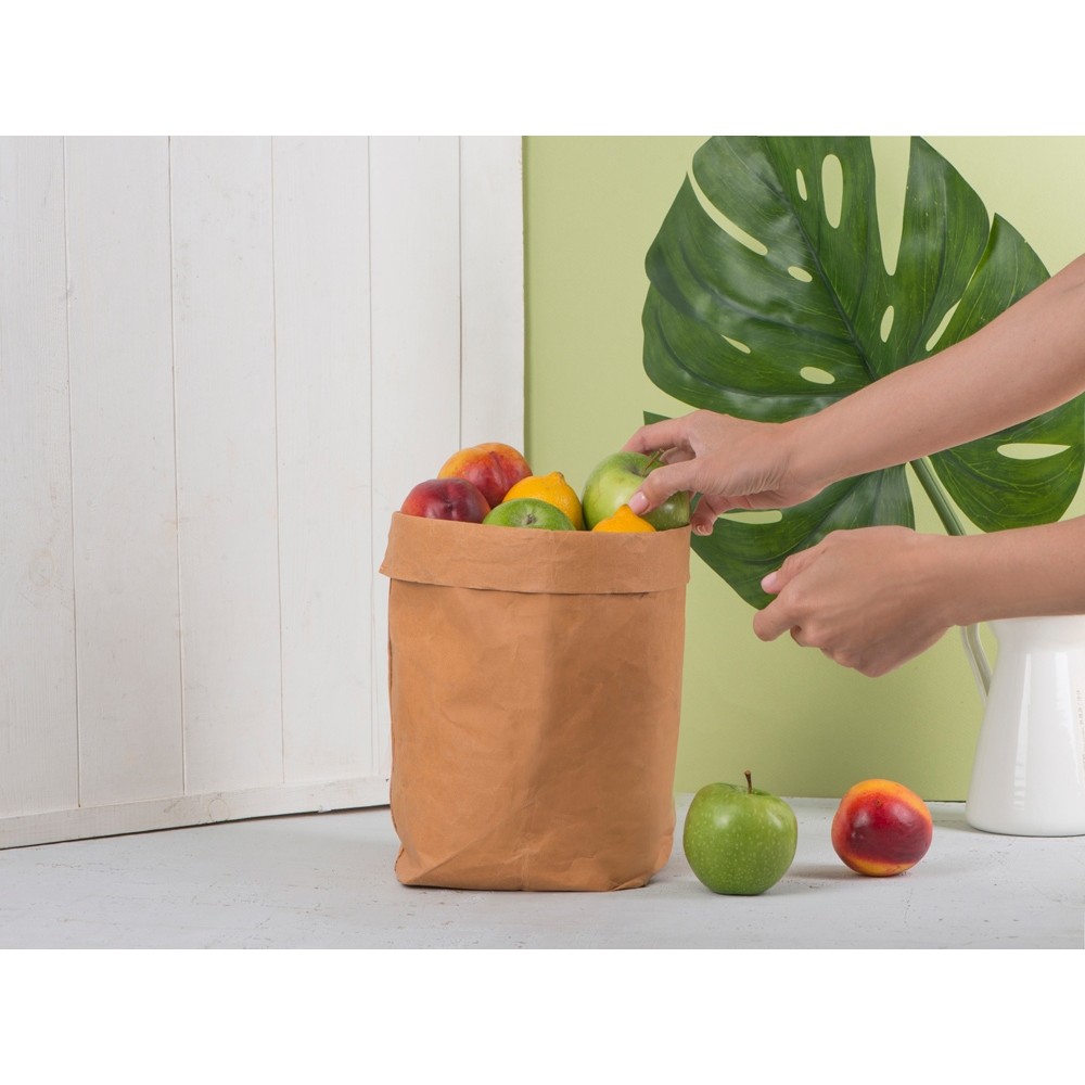 Водонепроницаемый органайзер из крафтовой бумаги представляет собой плотный пакет, который можно использовать различным образом. Он может использоваться для хранения овощей и фруктов в холодильнике, быть местом хранения для мелочей в офисе, в него можно поставить горшок с цветком и поддоном для декоративных целей или завернуть ланчбокс, прежде чем отправиться на работу — сценариев применения можно придумать множество.