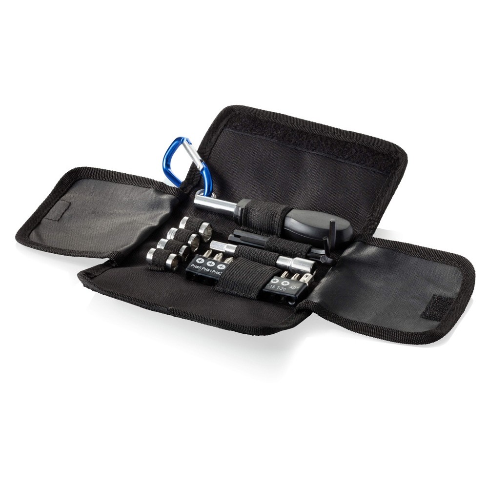 Набор из 19 инструментов. Небольшой складной набор из 19 инструментов с карабином для удобного хранения. Набор включает: 4 головки (7-8-9-10 мм), 1 отвертку для головок, 10 насадок для отвертки, 1 удлинитель и 3 шестигранных ключа (3-4-5 мм). 600D и чехол из ПУ.