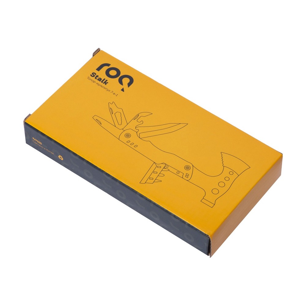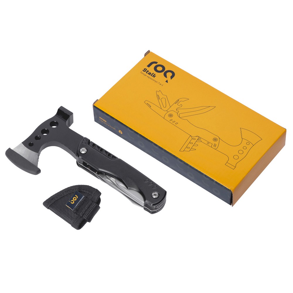 Топор-мультитул 7-в-1 «Stalk» бренда roq выполнен из нержавеющей стали 420 марки. Обладает значительным весом в 404 грамма для удобства работы топором или молотком. Товар поставляется в брендированном нейлоновом чехле с защитной накладкой на острие топора, что делает его транспортировку абсолютно безопасной.