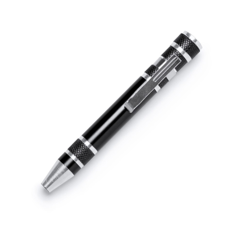 Алюминиевый мультитул в форме ручки. В комплекте 8 головок бит