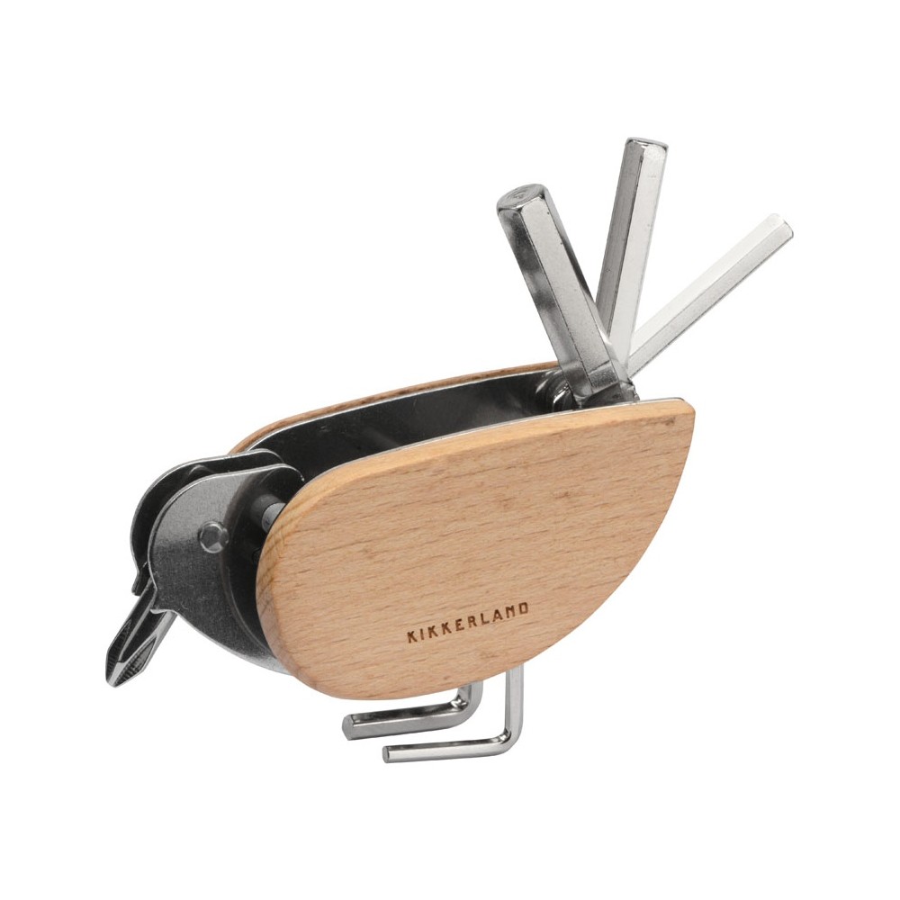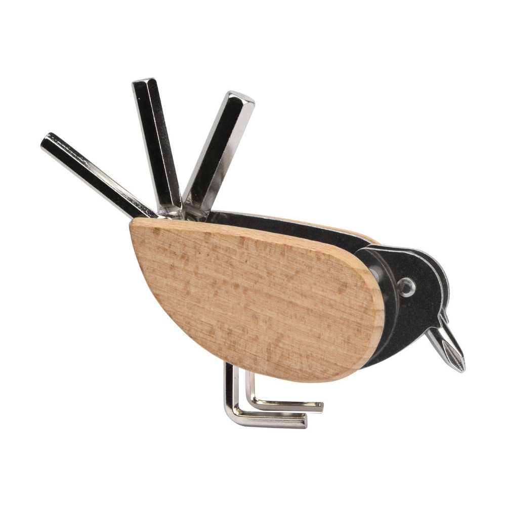 Очаровательный мультитул в виде птицы может показаться просто миленькой фигуркой, но пусть вас не смущает ее милый вид – на самом деле это многофункциональный инструмент 6-в-1! Клюв птички представляет собой крестовую отвертку из нержавеющей стали, ее ножки – это шестигранный шлиц на 3 и 2 мм, а хвостовые перья – шестигранники на 6, 5 и 4 мм, которые всегда готовы прийти вам на помощь. Бока птички – из букового дерева, их можно украсить логотипом при помощи гравировки, УФ-печати или тампопечати, чтобы украсить пернатое создание.