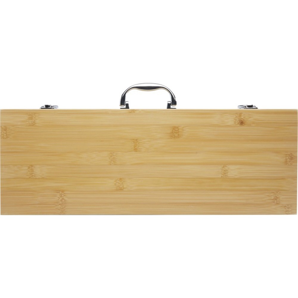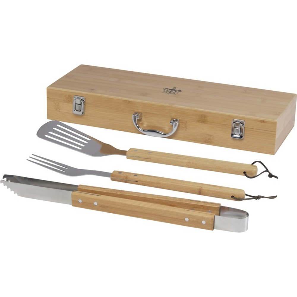 Набор для барбекю из 3 предметов из бамбука: лопатка (42 x 9,5 см), щипцы (46 x 2,2 см) и вилка (43 x 3,2 см). Набор поставляется в подарочной коробке из бамбука (51,5 x 18,2 x 7,2 см). Ручки и подарочная коробка изготовлены из бамбука, который производится в соответствии со стандартами устойчивого развития.