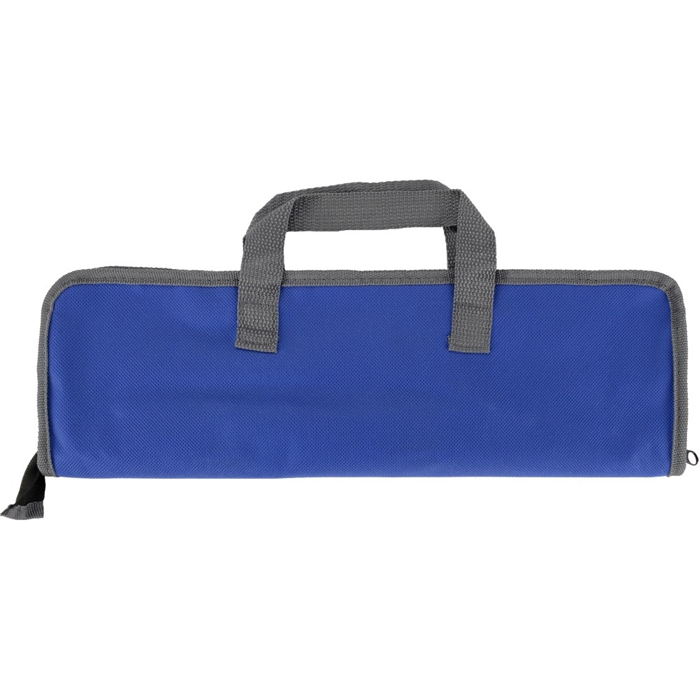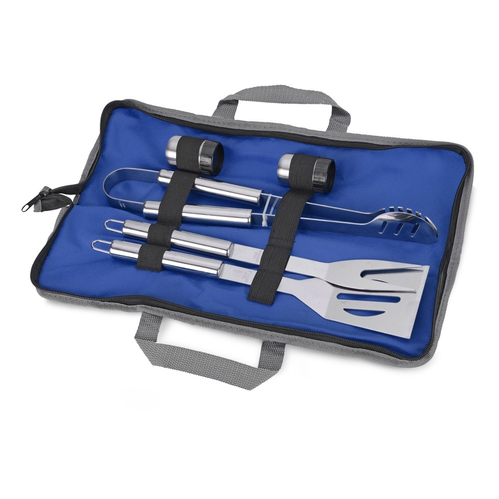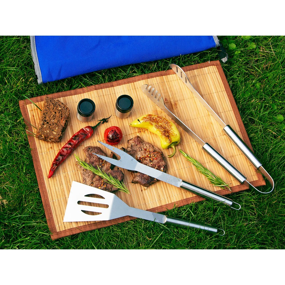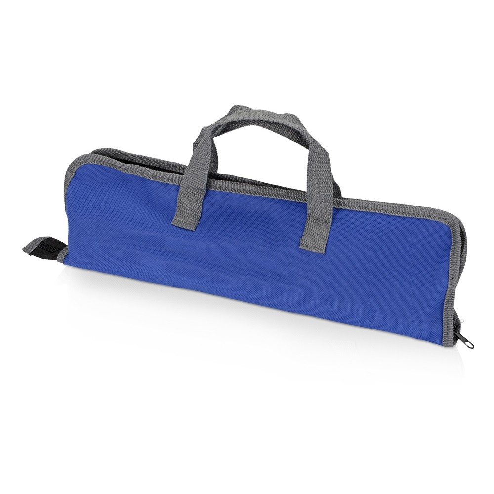 Набор включает в себя вилку, лопатку, щипцы, солонку и перечницу. Удобный чехол на замке-молнии позволяет компактно хранить составляющие набора. На чехол можно нанести изображение или надпись.