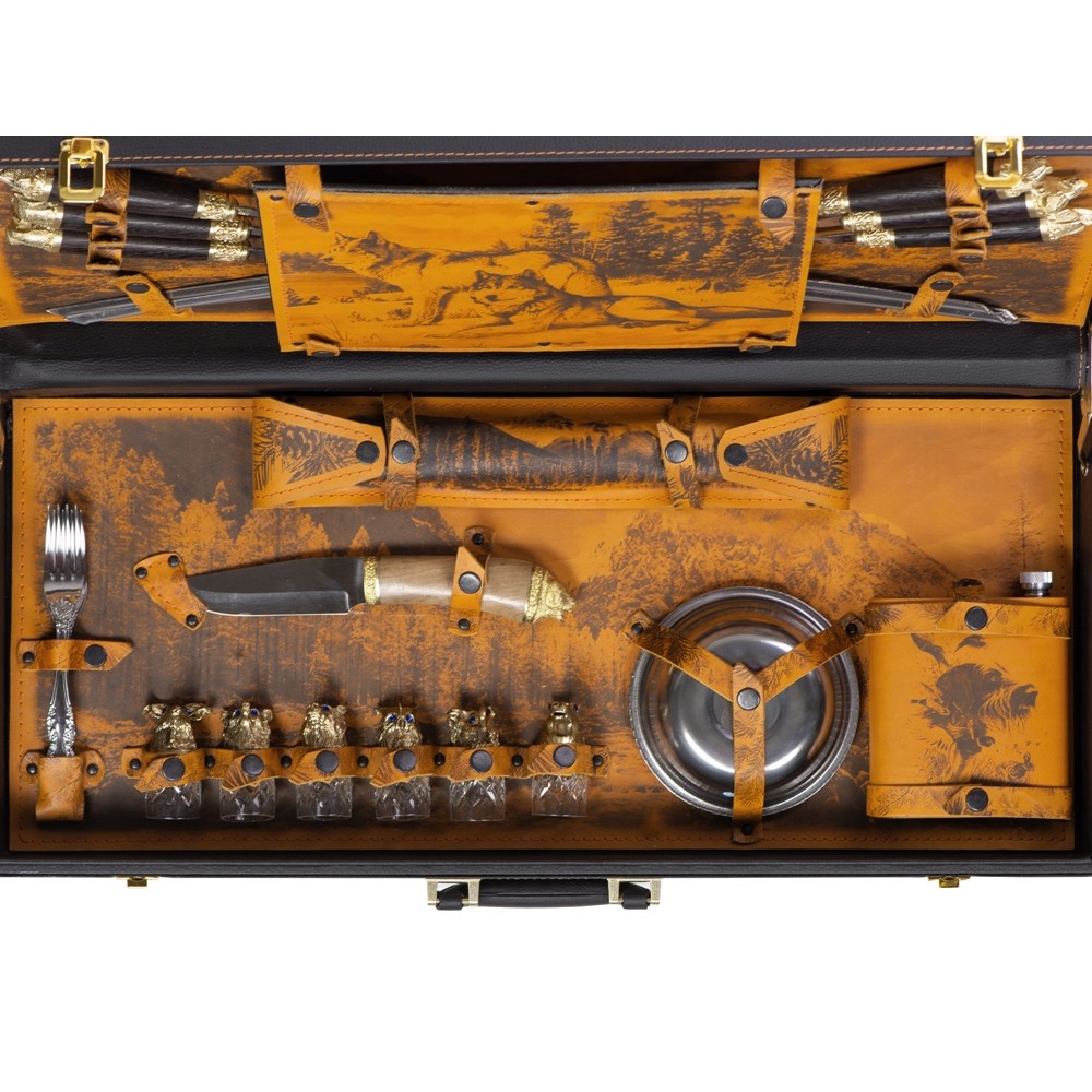 Вес7600 Комплектностьшампура большие- 6 шт, доска разделочная, вилка- 6 шт, нож, стопка- 6 шт, тарелка- 6 шт, фляга, шампура маленькие- 6 шт, мангал Материал товарасплит-кожа/натуральная кожа, нержавеющая сталь
