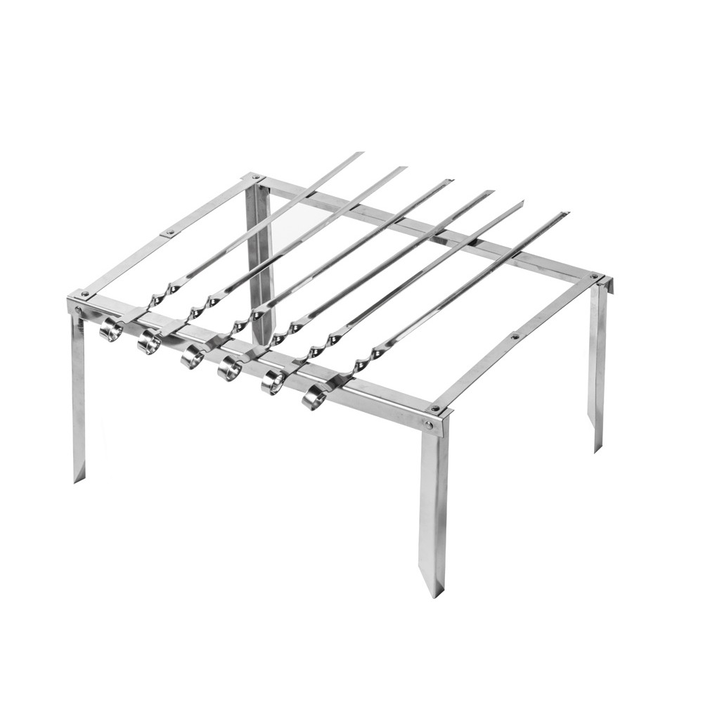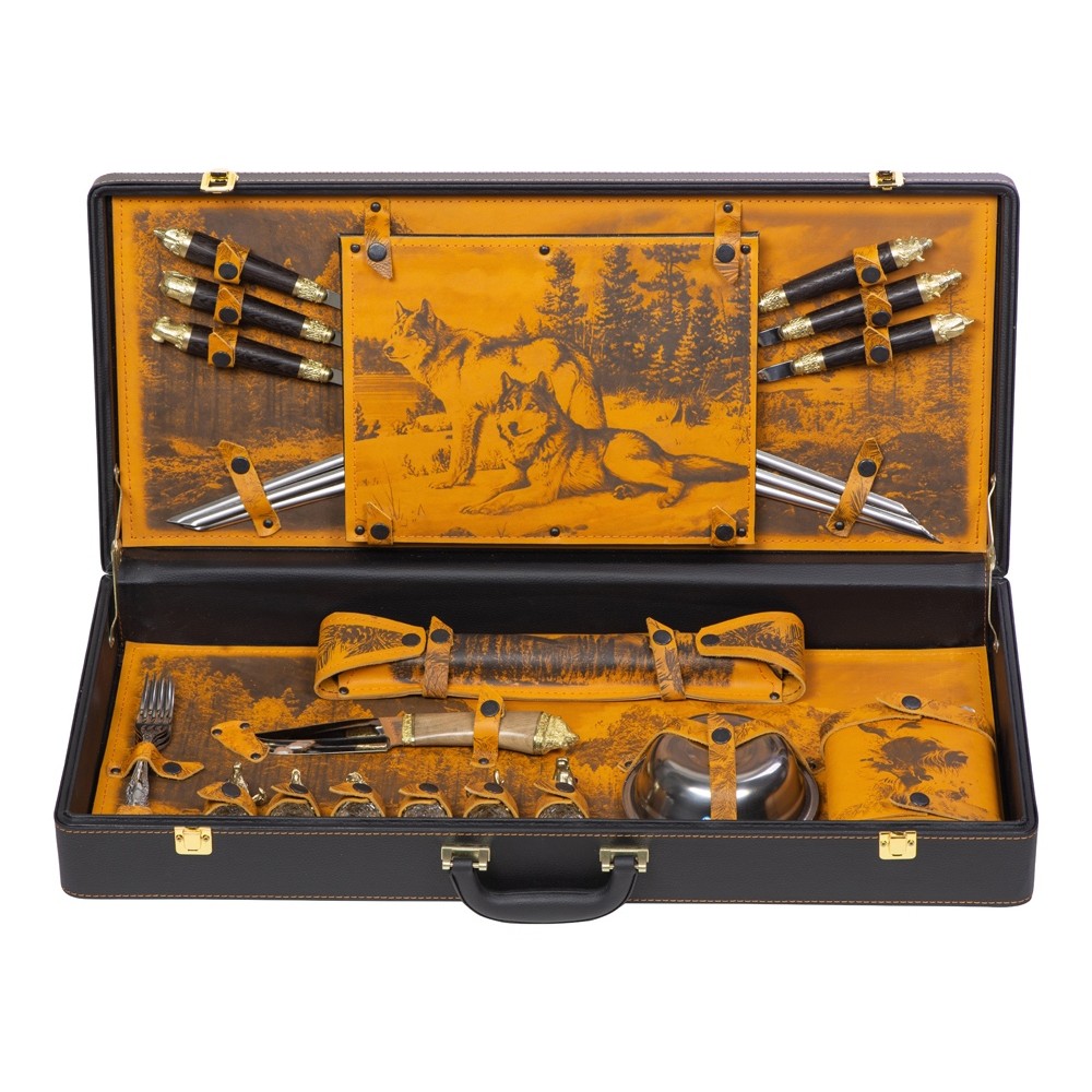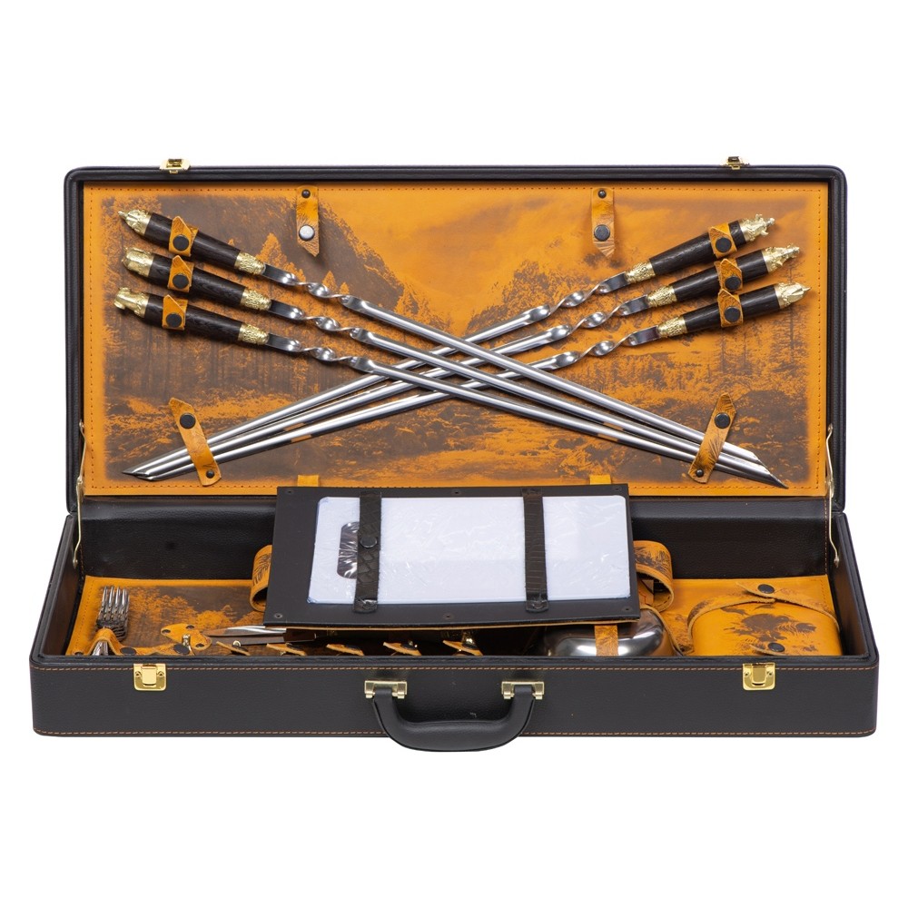 Комплектность шампура большие- 6 шт, доска разделочная, вилка- 6 шт, нож, стопка- 6 шт, тарелка- 6 шт, фляга, шампура маленькие- 6 шт, мангал