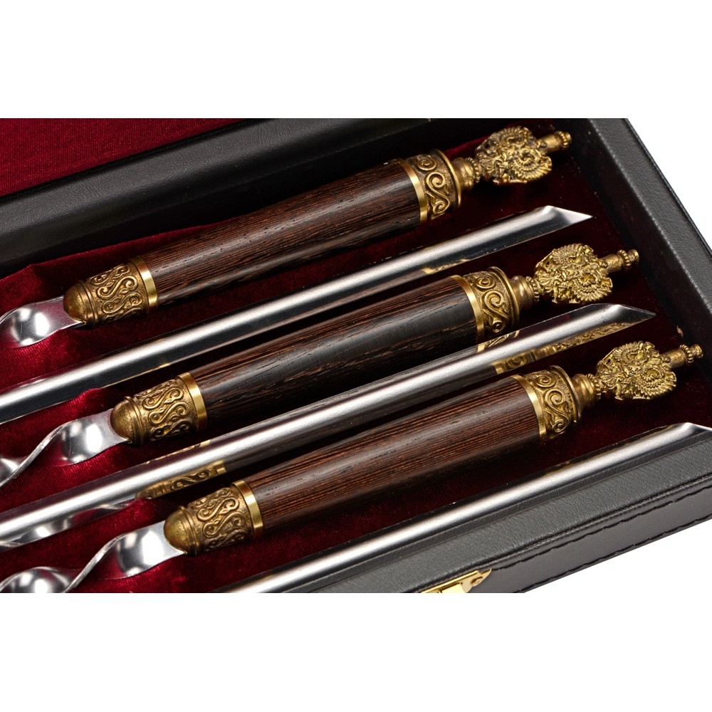 Шампура из нержавеющей стали с ручками из дерева венге и литьем в виде герба РФ. Дипломат из натуральной кожи с бархатной отделкой.