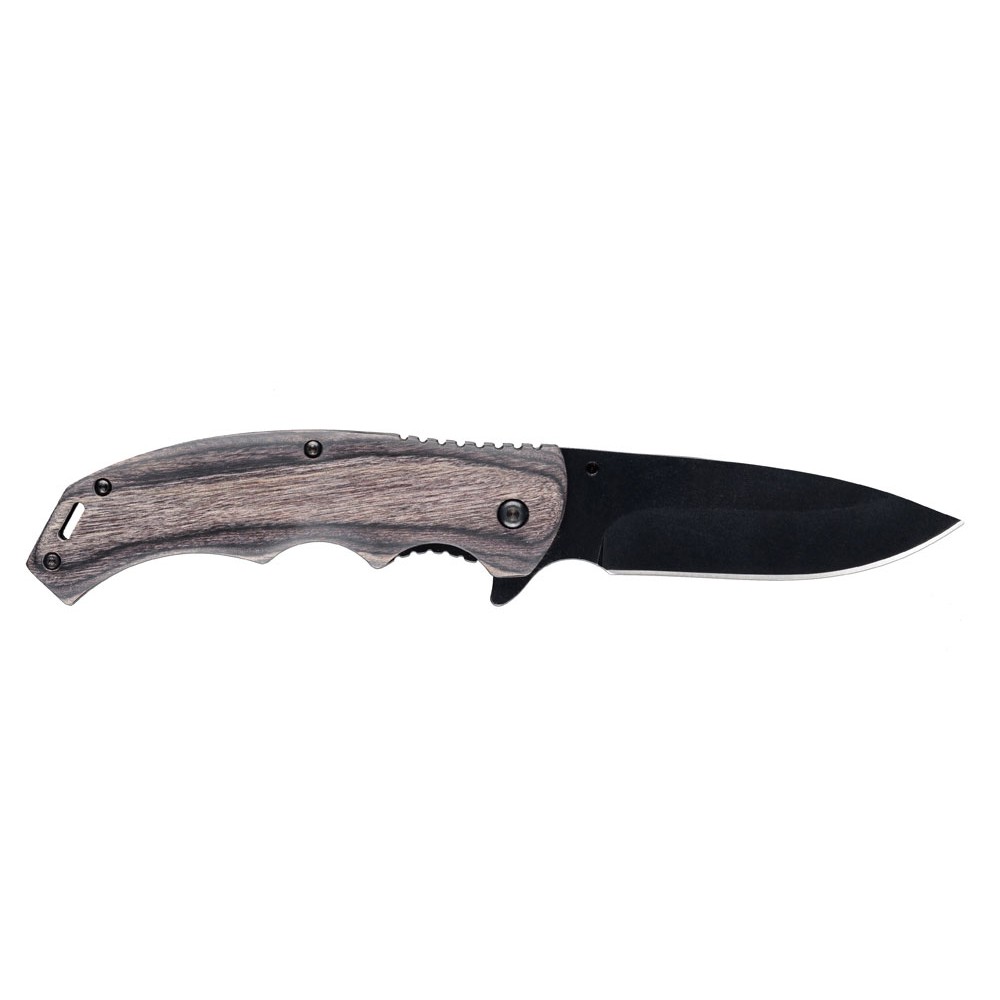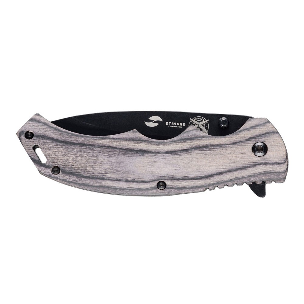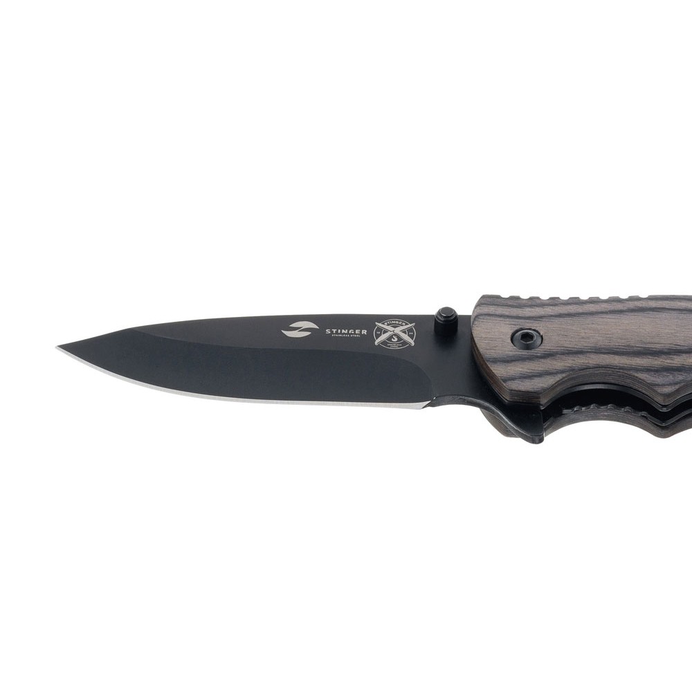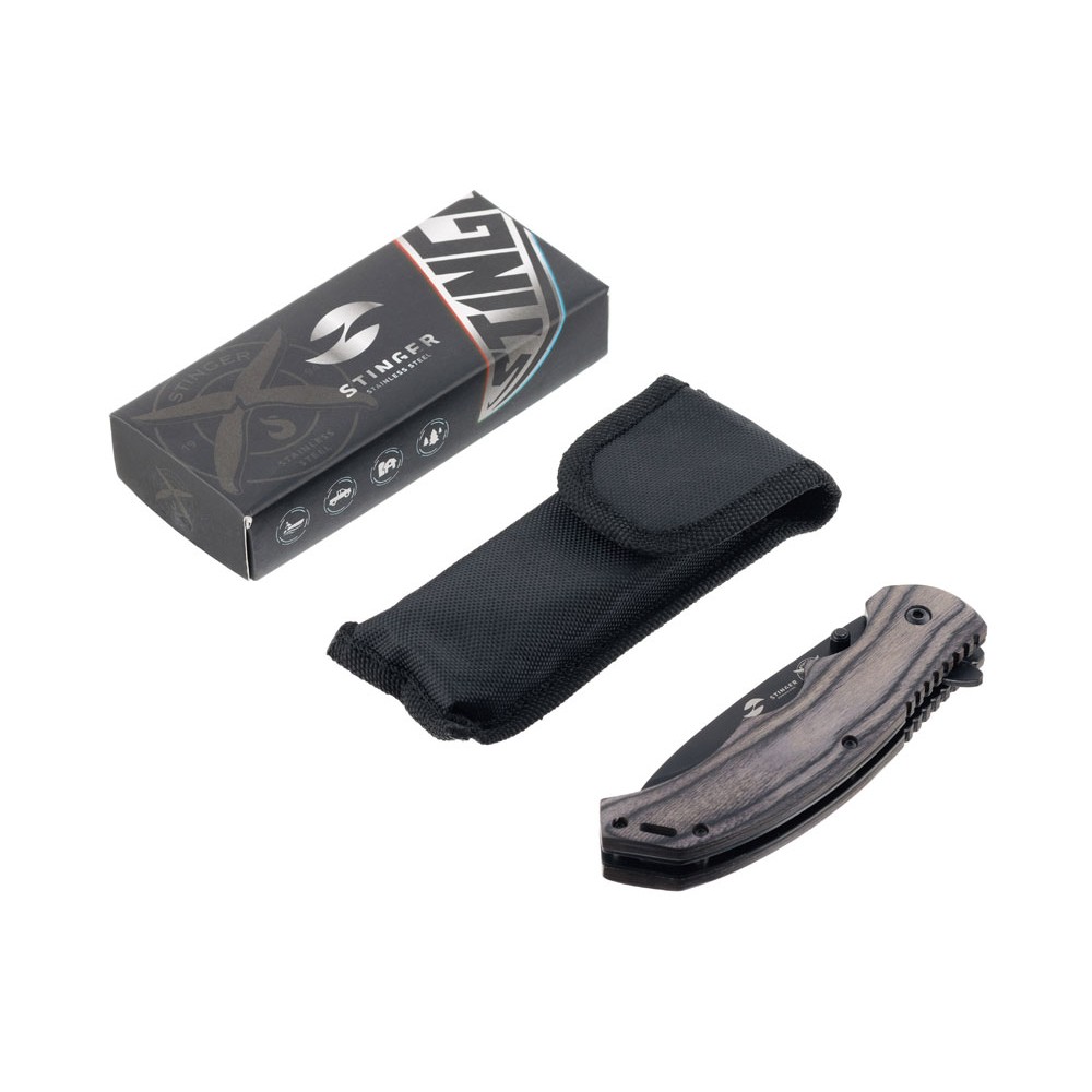 • Нож складной Stinger, 120 мм, (чёрный), материал рукояти: дерево/сталь (серый), в картонной коробке