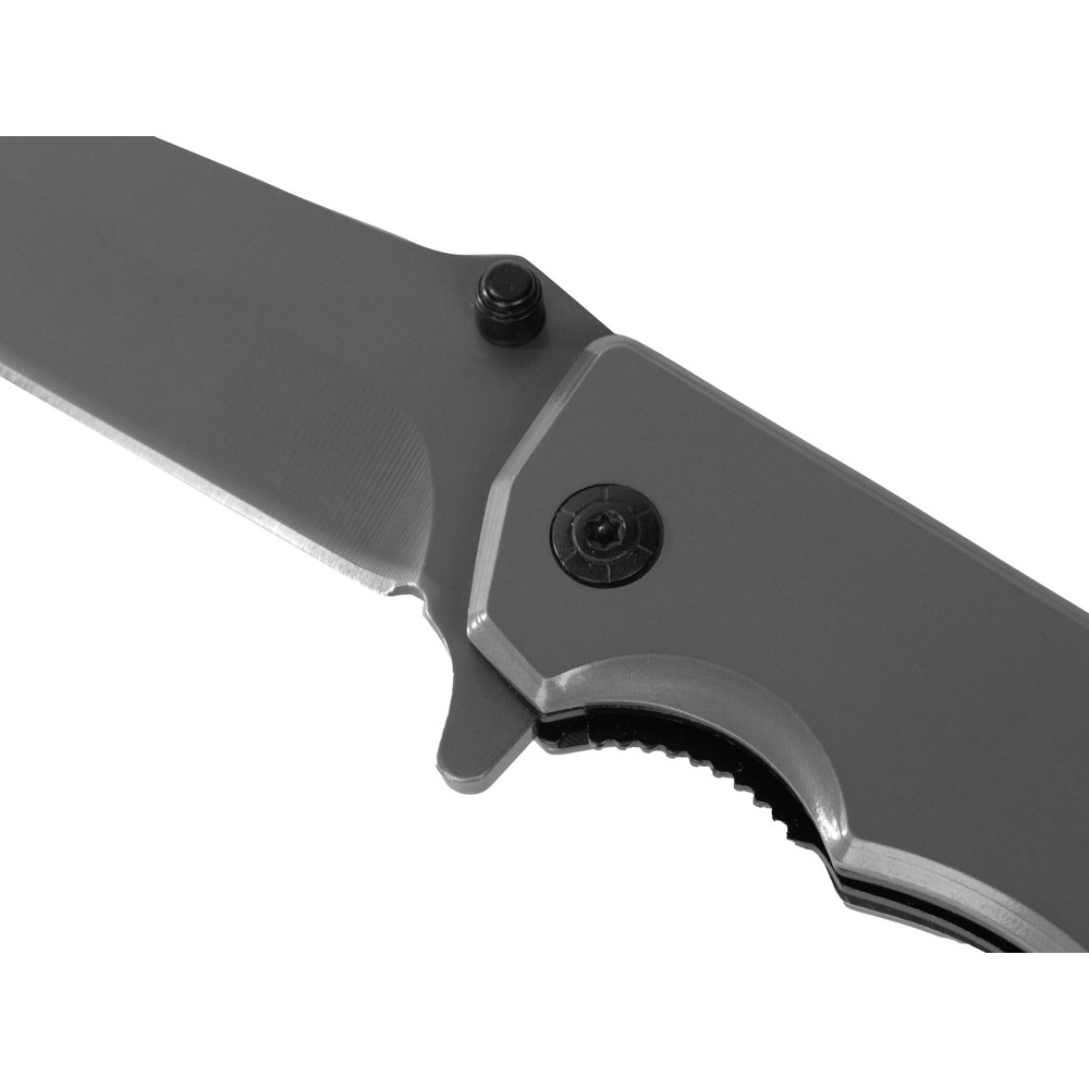 Титановое покрытие корпуса и лезвия защищает от механических повреждений и увеличивает коррозионную стойкость изделия. Нож очень удобен для использования — выступ для быстрого открытия ножа указательным пальцем на ощупь, на лезвии с двух сторон — специальные выступы для открытия большим пальцем, а фиксатор Liner-lock не дает ножу случайно захлопнуться. На рукоятке имеется отверстие для ремешка.