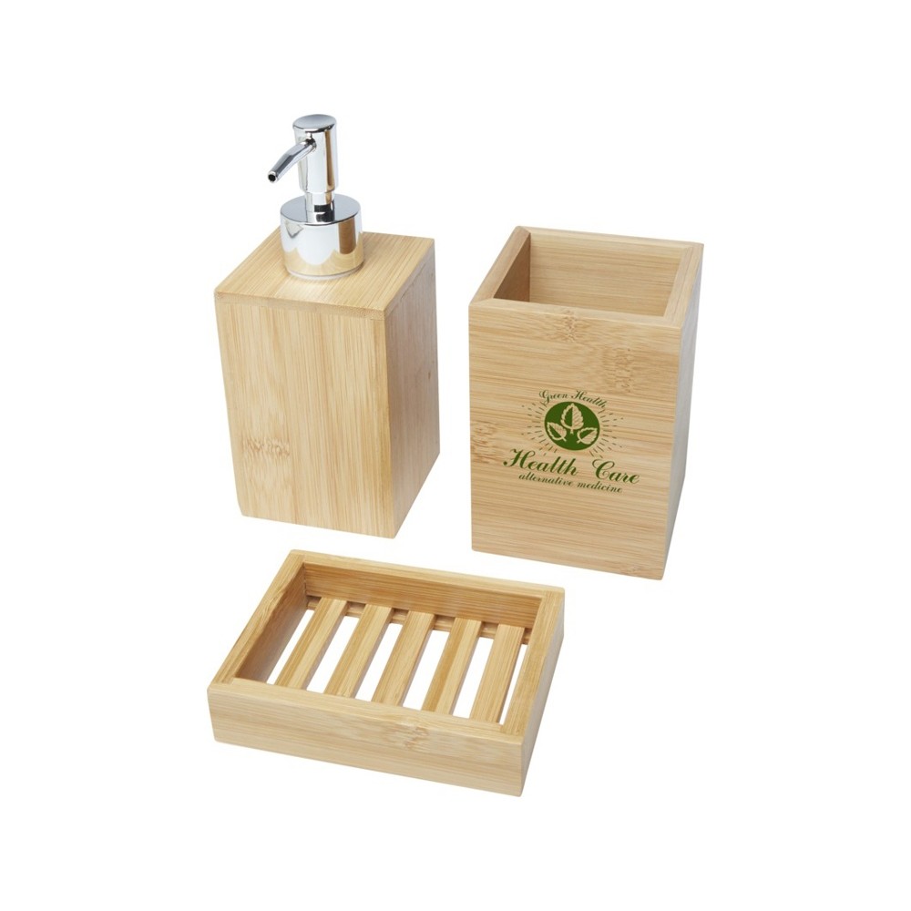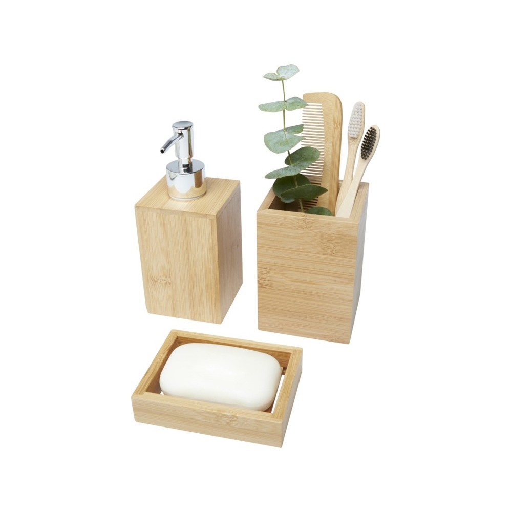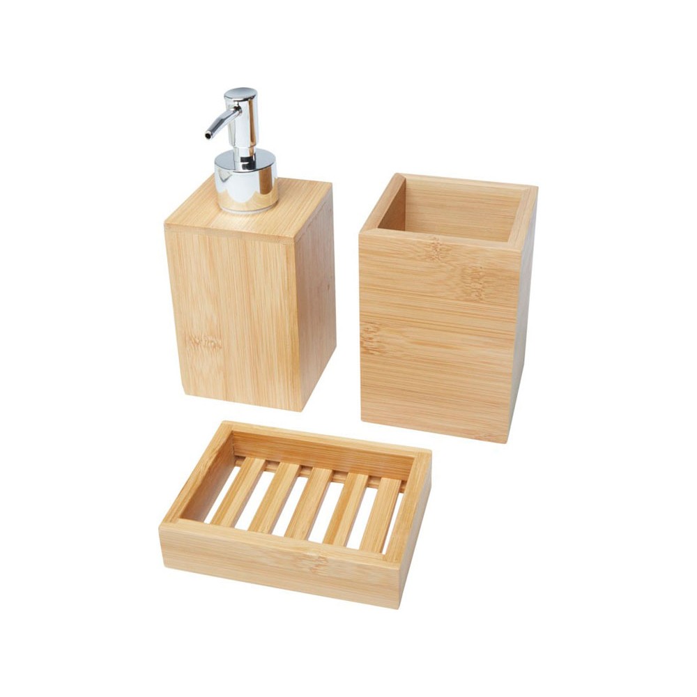 Набор из 3-х аксессуаров из бамбука с современным дизайном для ванной комнаты, состоящий из мыльницы с ситечком (11 x 8,2 x 2,4 см), дозатора для мыла или лосьона (7,1 x 7,2 x 16,8 см) и держателя для зубных щеток (8 x 8 x 11,5 см). Используемый бамбук поставляется и производится в соответствии со стандартами устойчивого развития.