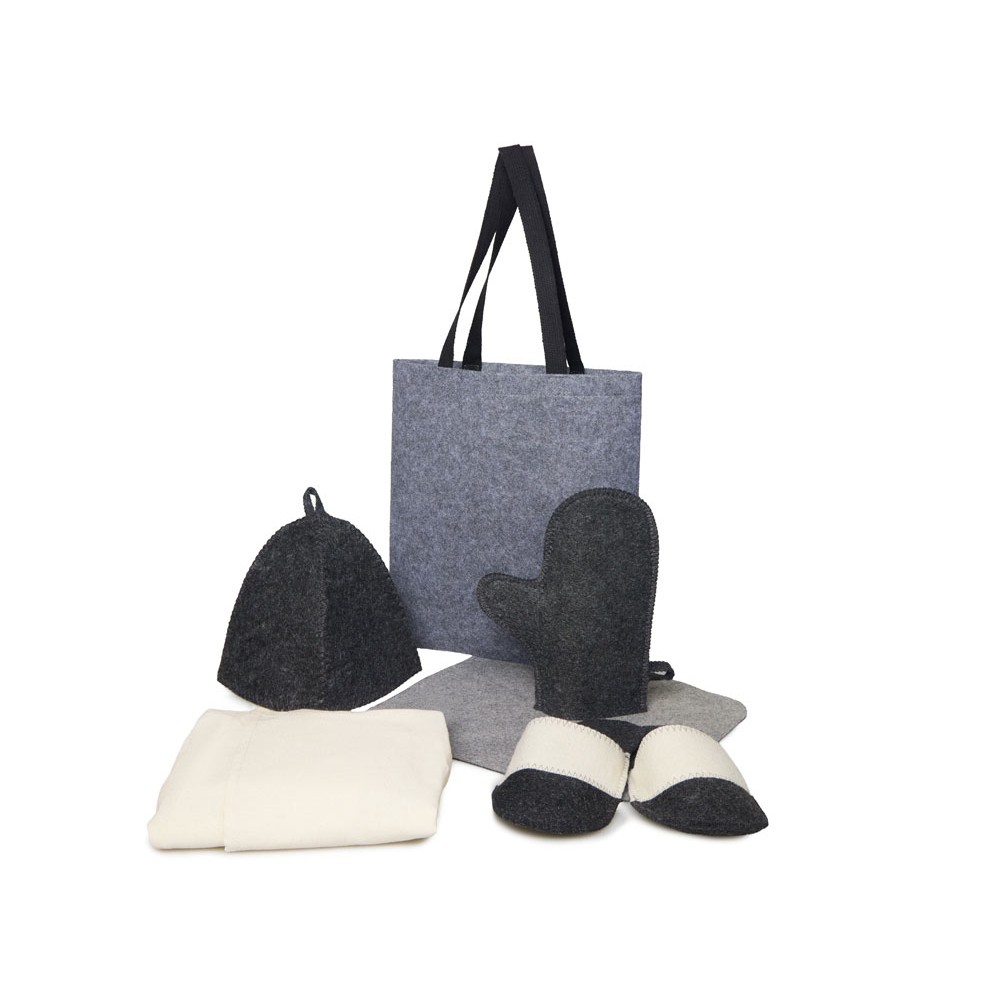 Банный набор "Healing" для настоящего ценителя сауны: коврик, мужской холщовый килт, рукавица, шапка, двуцветные тапочки — всё в стильном фетровом шоппере.