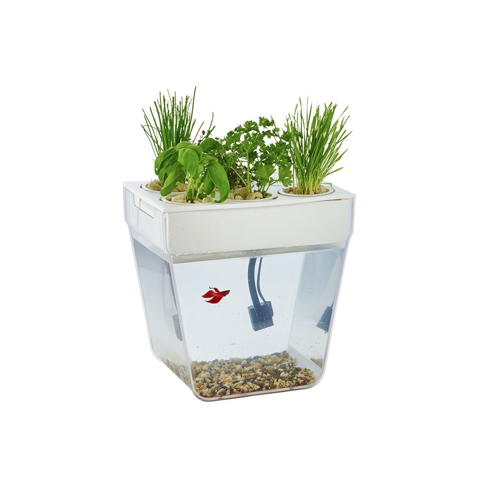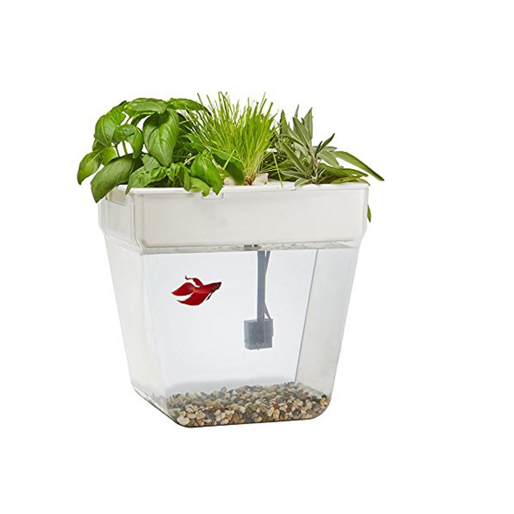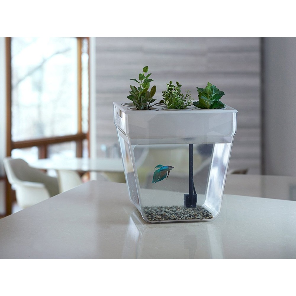 По сути — это замкнутая экосистема, поддерживающая баланс между растениями и рыбкой. Её отходы с помощью насоса поднимаются к горшочкам сверху и питают вашу маленькую плантацию. Взамен рыбка получает очищенную воду, а у любого городского жителя всегда есть в наличии свежая зелень к столу.