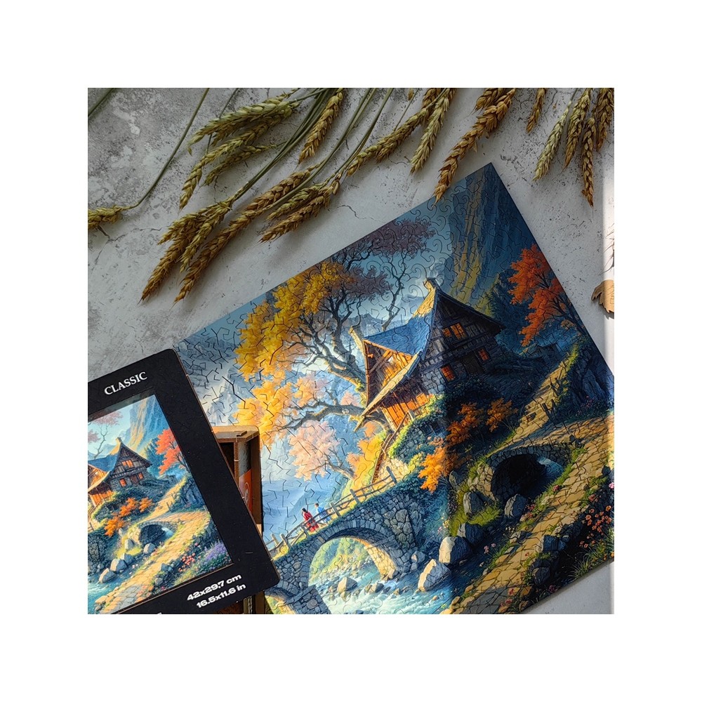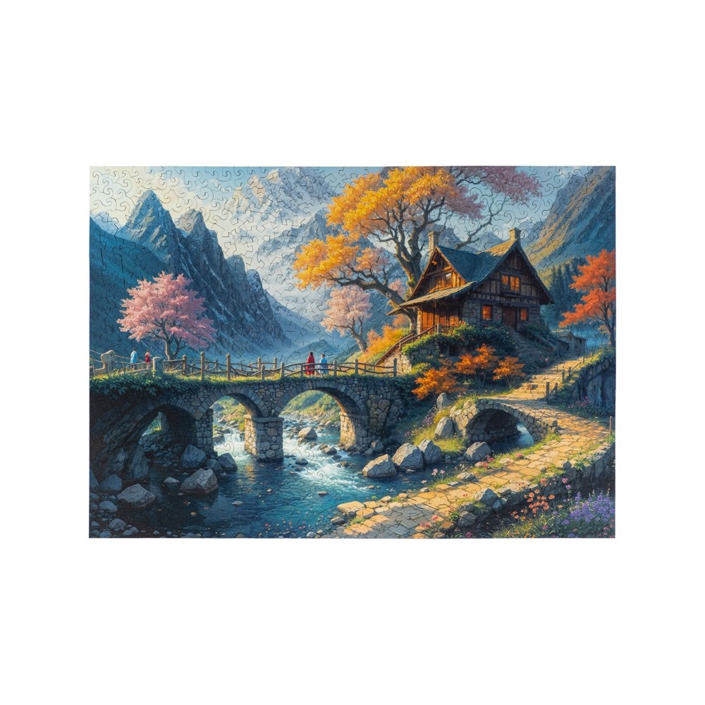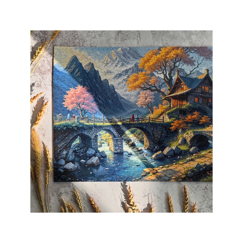 Именно она подсказала нам, каким должен быть рез этого пазла. Горные вершины состоят из деталей с острыми краями. Это напоминание о жизненных вызовах и стремительно меняющихся обстоятельствах. А дом и журчащий перед ним ручей сделаны из деталей с плавными очертаниями. Они говорят о семейном тепле, поддержке близких людей, и уюте.
