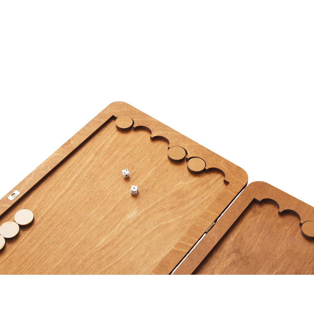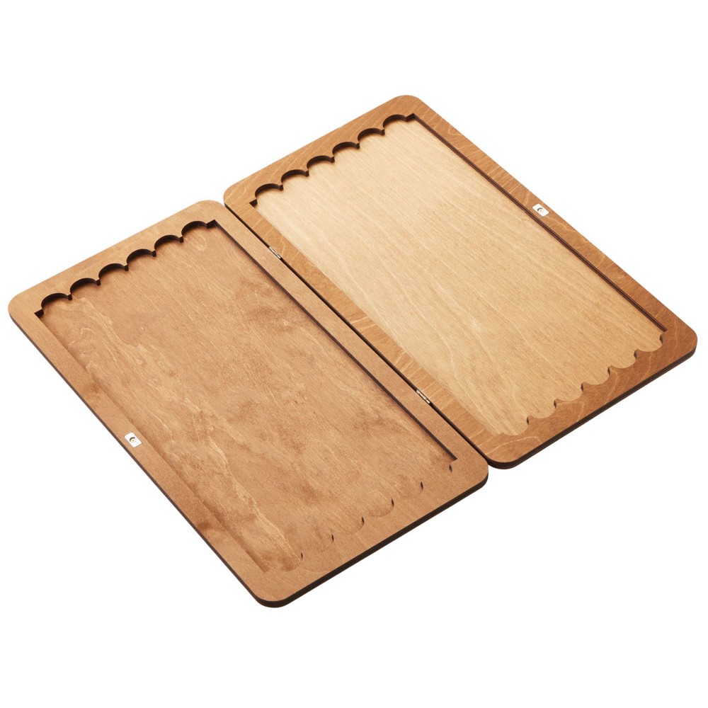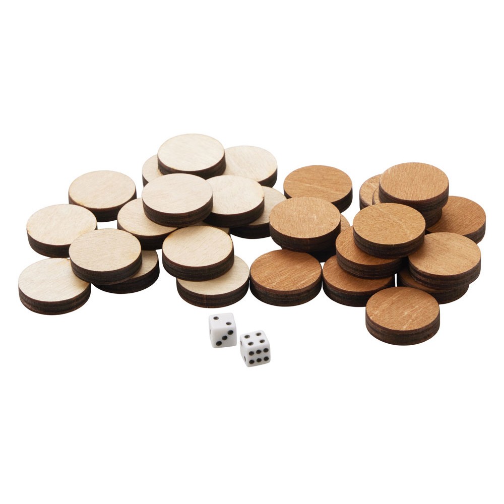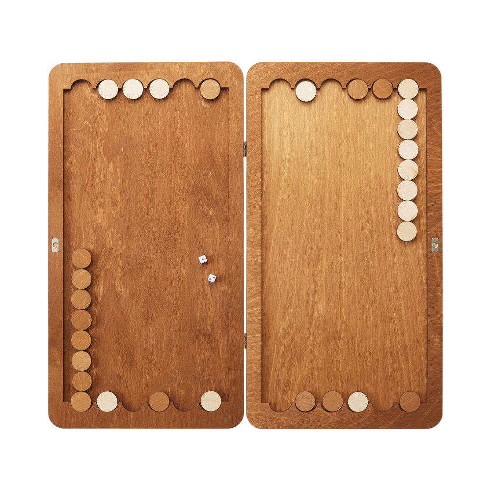 В комплект входят фишки из фанеры двух оттенков, гармонирующих с базовым цветом доски.