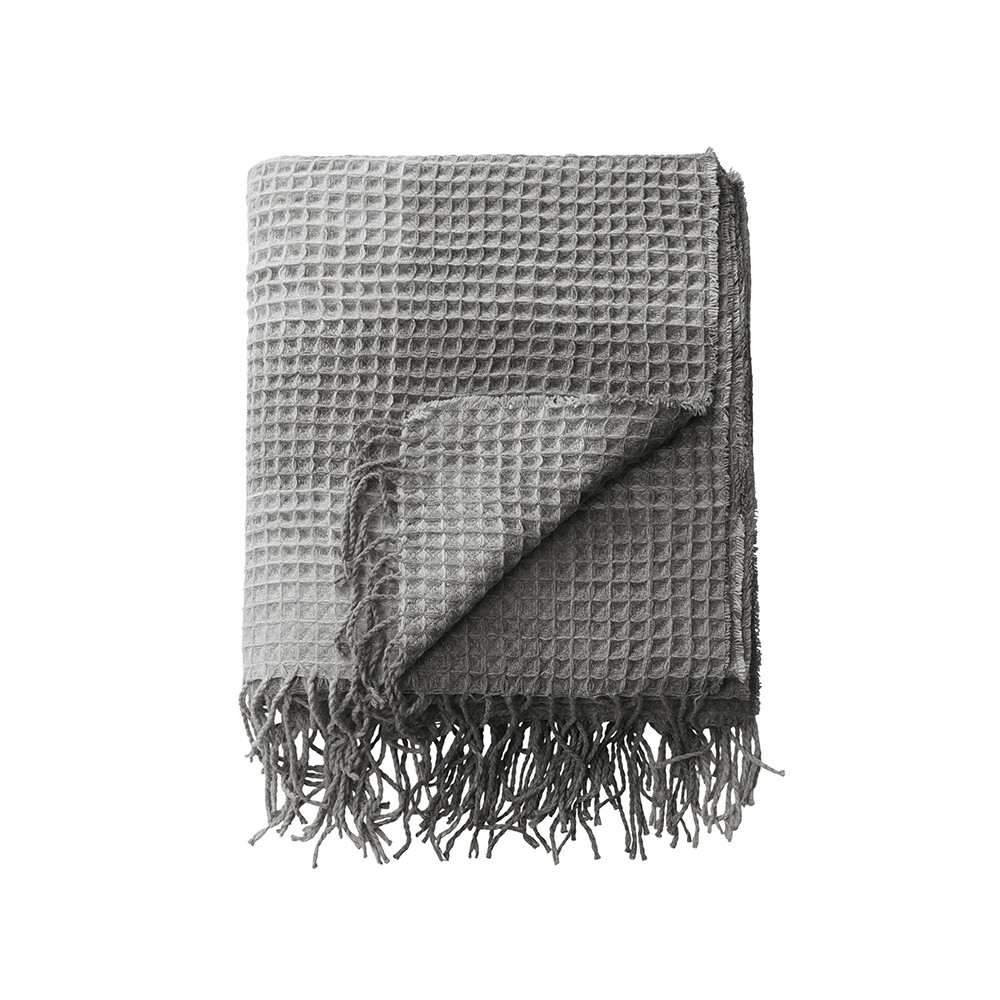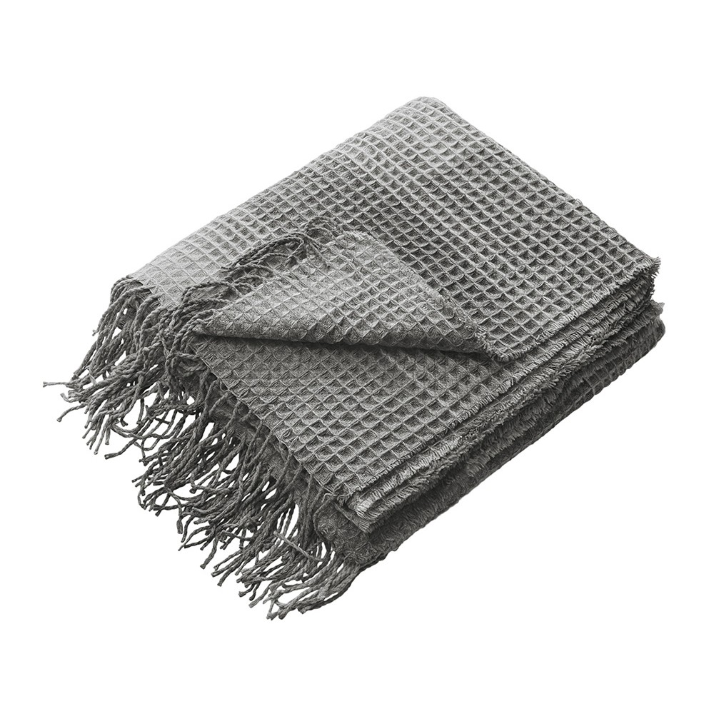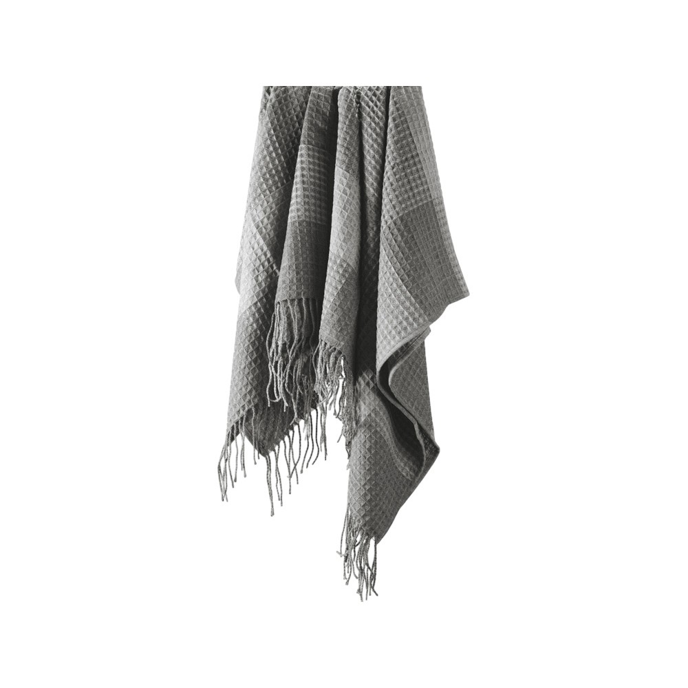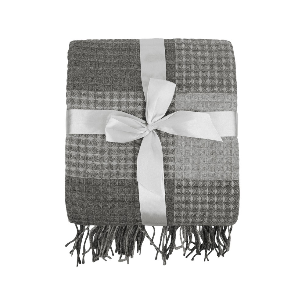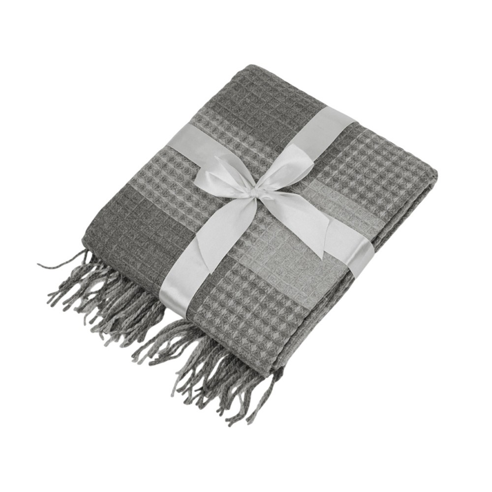 Теплый плотный плед из акрила, украшенный бахромой, имеет приятную на ощупь текстуру поверхности и создает атмосферу комфорта и уюта.